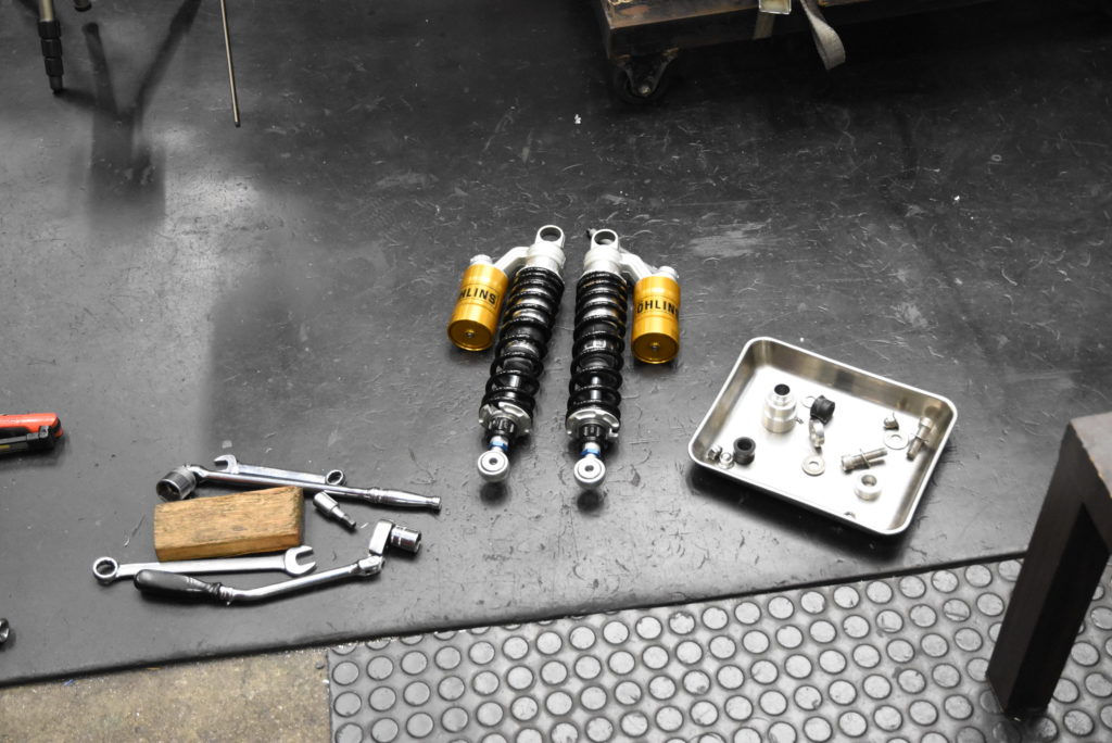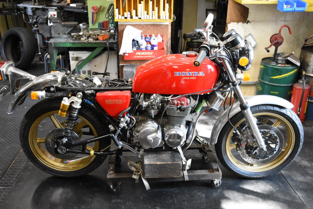 CB400F 足回り モディファイ 車体を台車にセットして長期戦に備えます!!スイングアームの幅・ショックマウントの幅・フレームのショックマウント幅などなどをレザーで測定してCADで合わせみました♪ 何とかチェーンと左リアショックが干渉しない位置を割り出しました!!リアサスボトムブラケット製作&左フレームサイド延長特殊ステンボルト製作などの課題は出ましたが何とか出来そうです♪ あすはスイングアームの取り外しと位置決めをしたいです!!