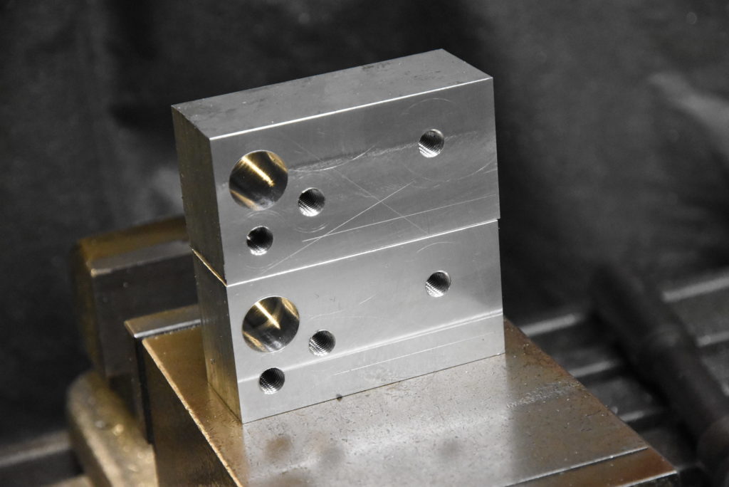 CB400F 足回り モディファイ 昨日寝る時に強度が気になったので夕方まで図面を少し修正して、何度も見直し&装着想定をしてアルミブロック切り出し&形成してCAD通りに穴開け加工をしました♪ これから薄く削ったりサスが入るチャンネル加工したりと難しい加工が続きます!まだクリアしていない所があるのでボルトが入る3個の穴はタップ加工しています、不必要な時は10mm穴にすれば良いので・・・!!