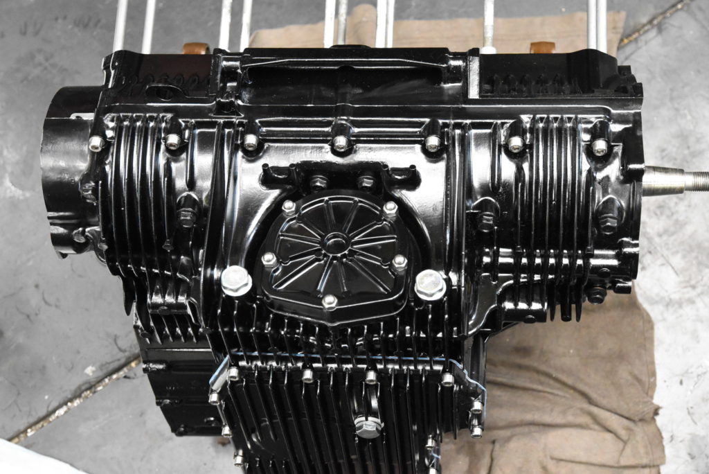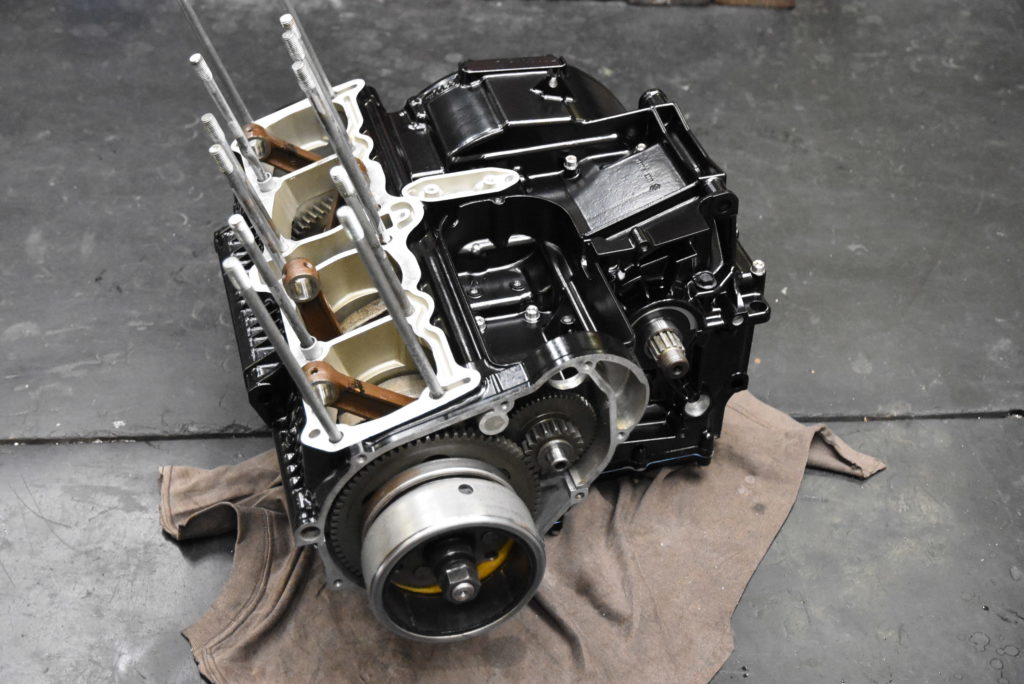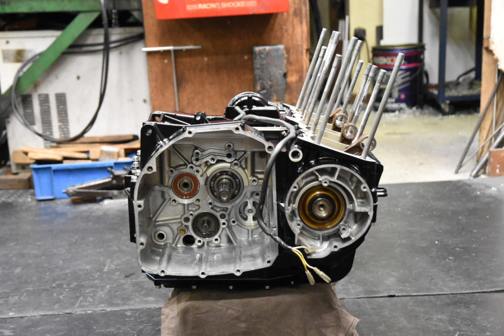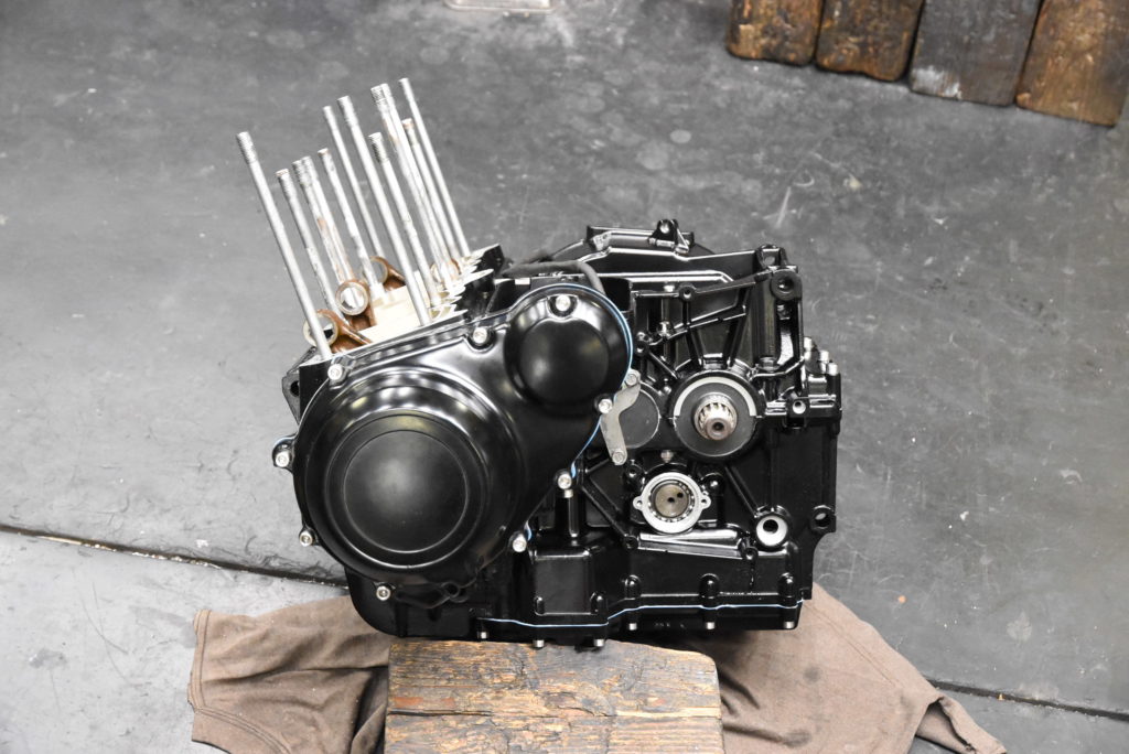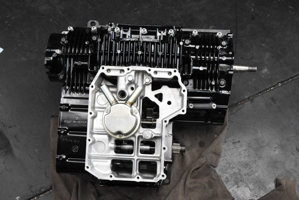 GSX1100S カタナ 1981年式 エンジン組み クランクシャフト&ミッションを入れてクランクケースを合体させました。ストレーナ&オイルパンケース!オイルフィルター&フィルターカバーと両サイド新品ボルト!マグネット組み立て&カバー取り付け!を切削ステンボルトで取り付けです。今日はここまで♪