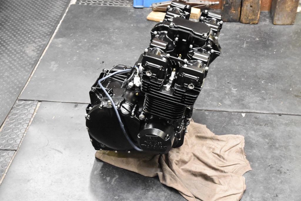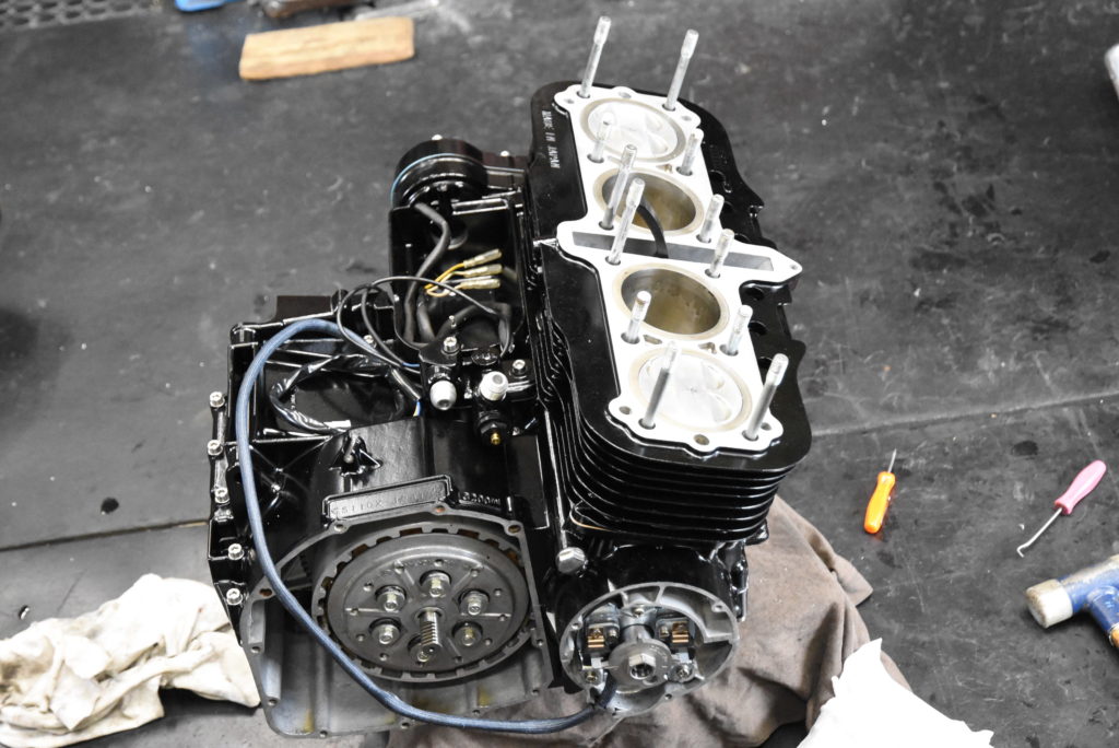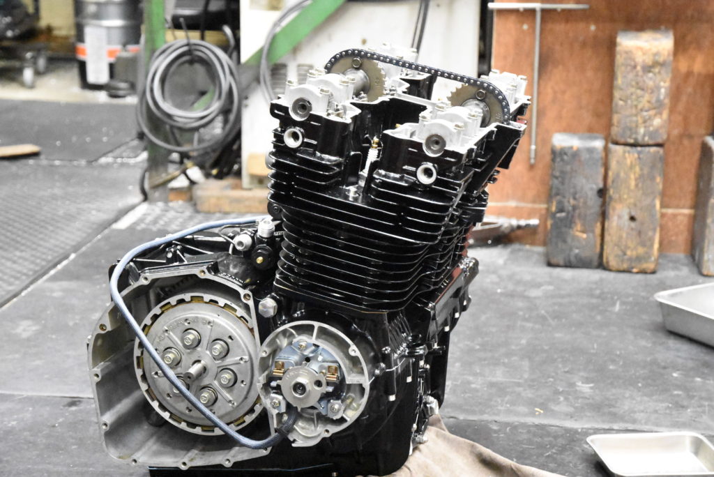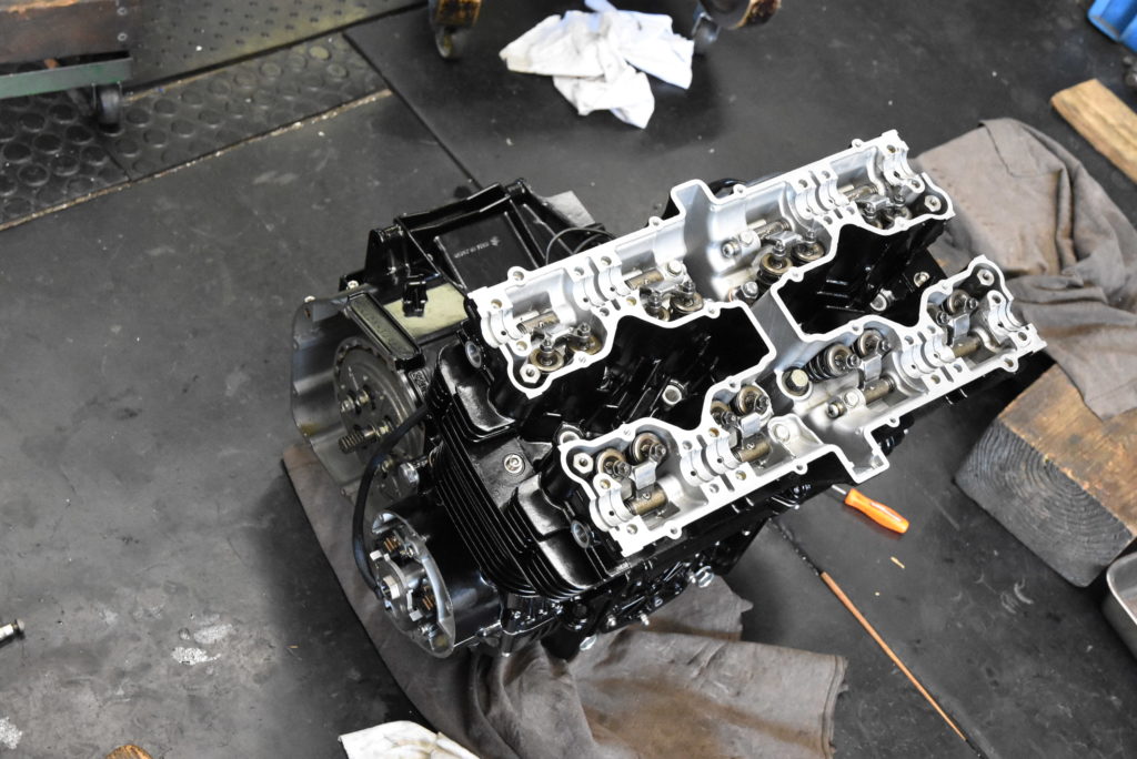 GSX1100S カタナ 1981年式 エンジン組み ピストン&リング・シリンダー・シリンダーヘッド・カムシャフトを組み込んでタペット調整を済ませました!ヘッドカバー&クラッチカバーを仮組してエンジンがほぼ完成です♪ 続いてフレームに乗せていきます!