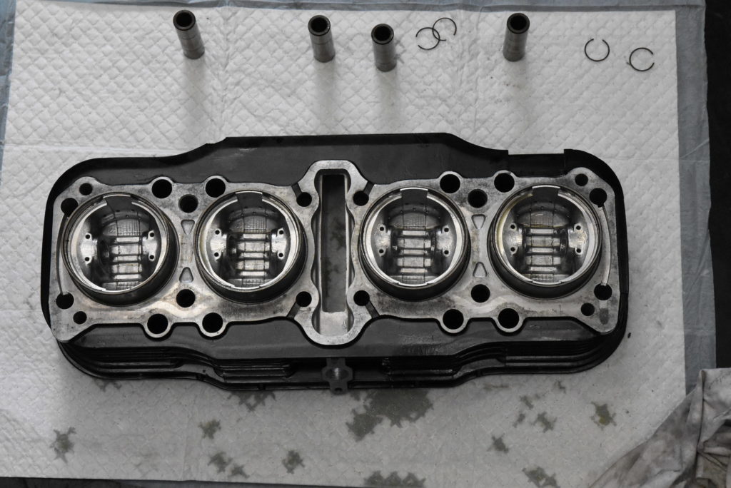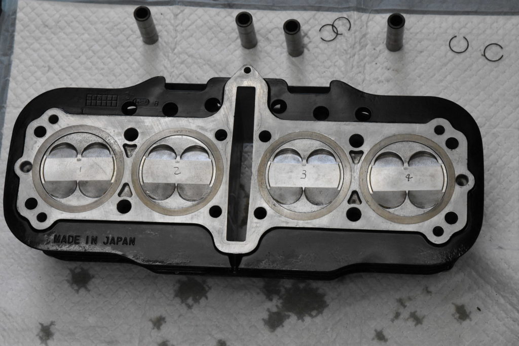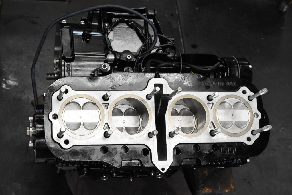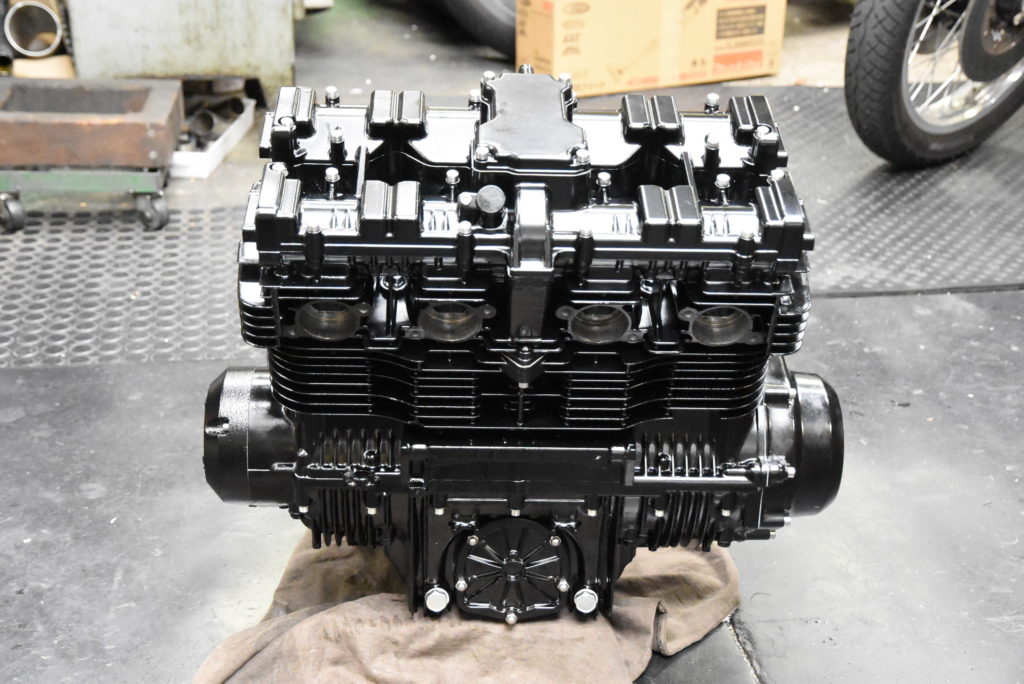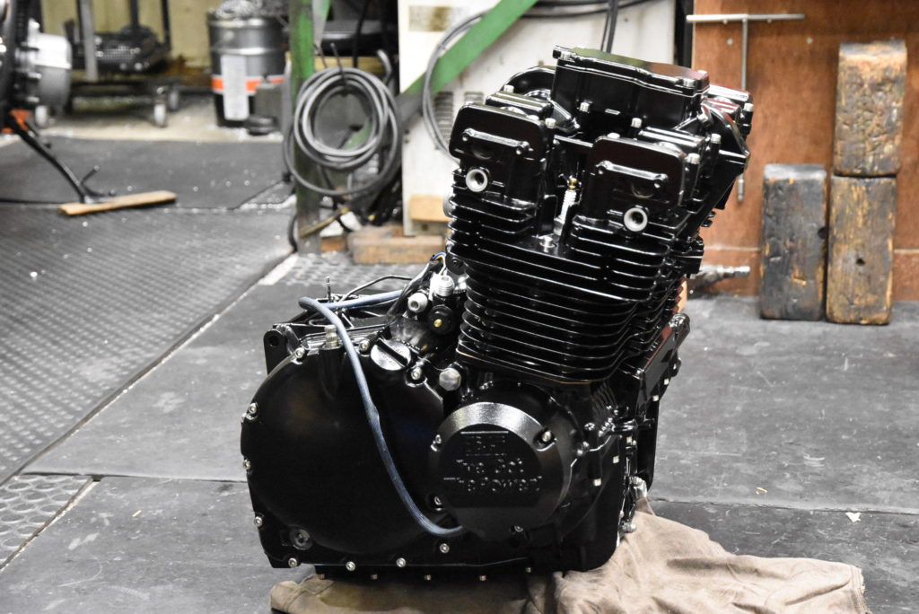 GSX1100S カタナ 1981年式 エンジン組み ピストン&リング・シリンダー・シリンダーヘッド・カムシャフトを組み込んでタペット調整を済ませました!ヘッドカバー&クラッチカバーを仮組してエンジンがほぼ完成です♪ 続いてフレームに乗せていきます!