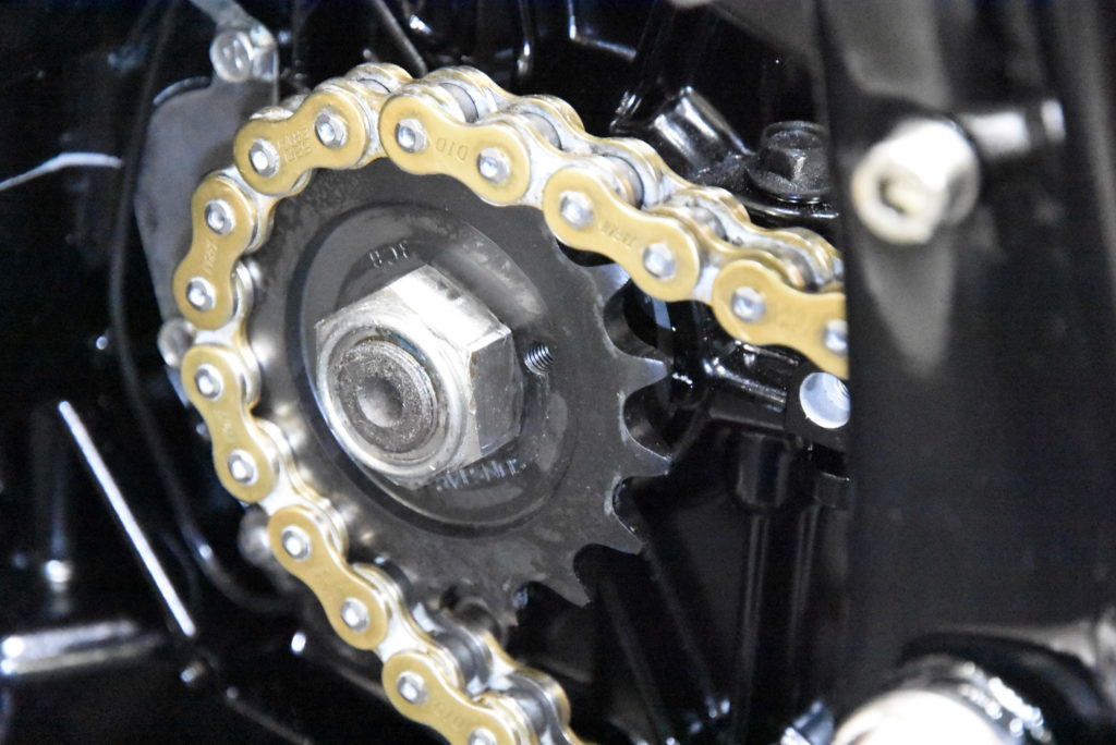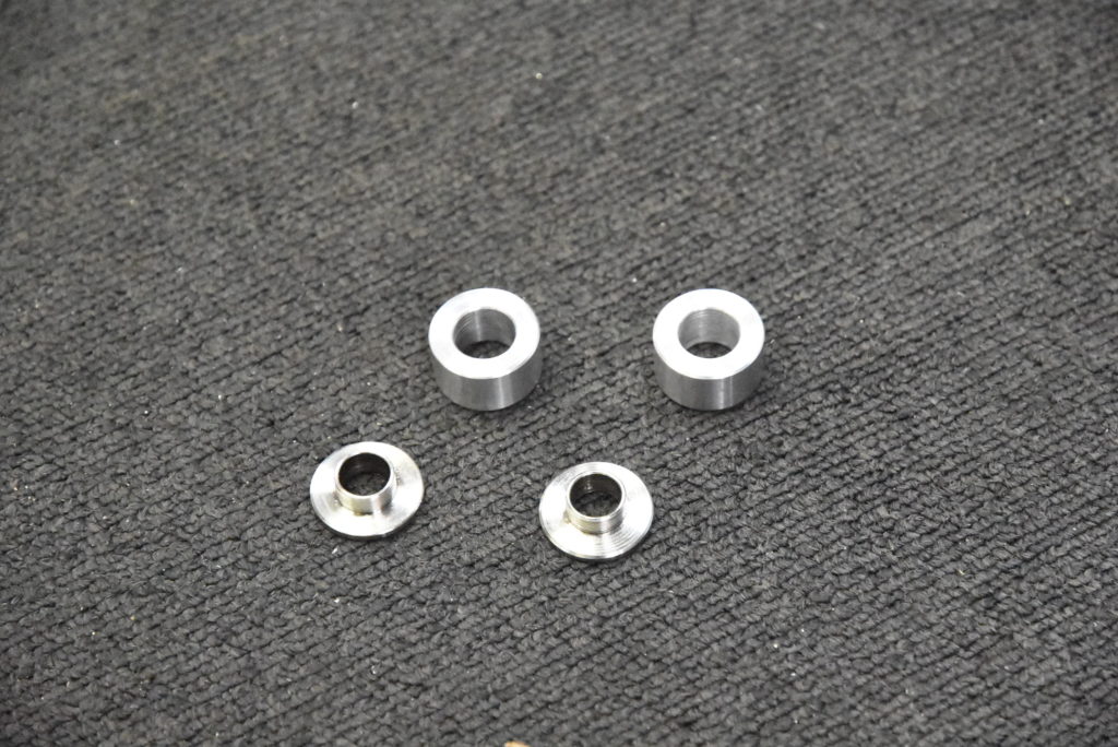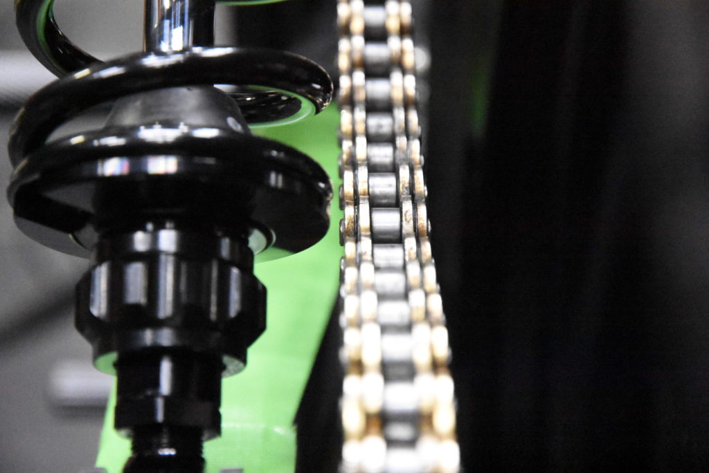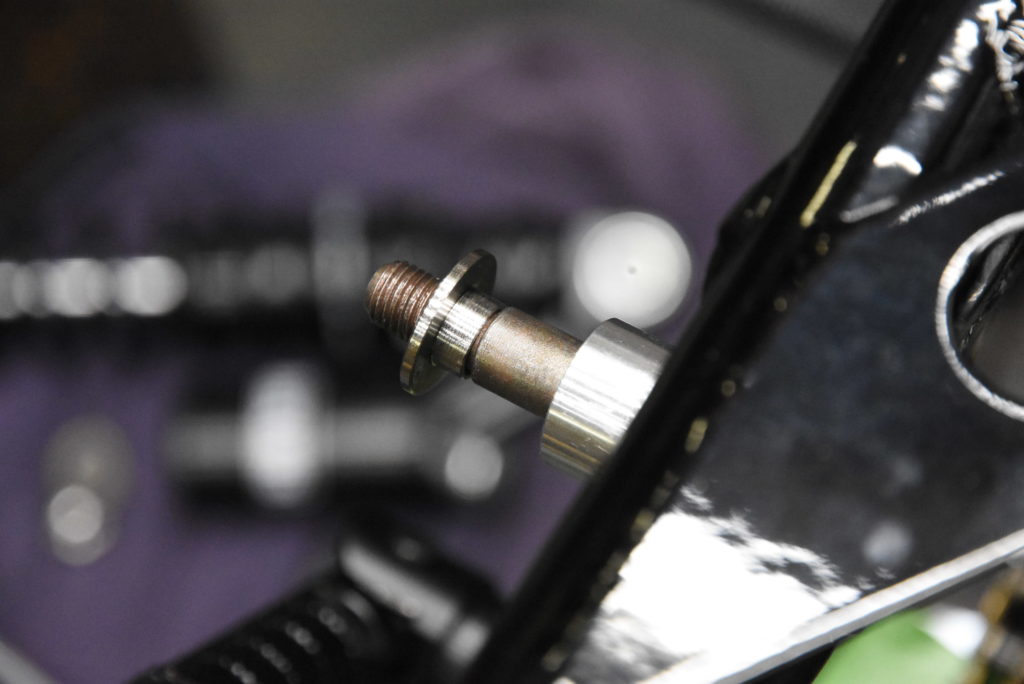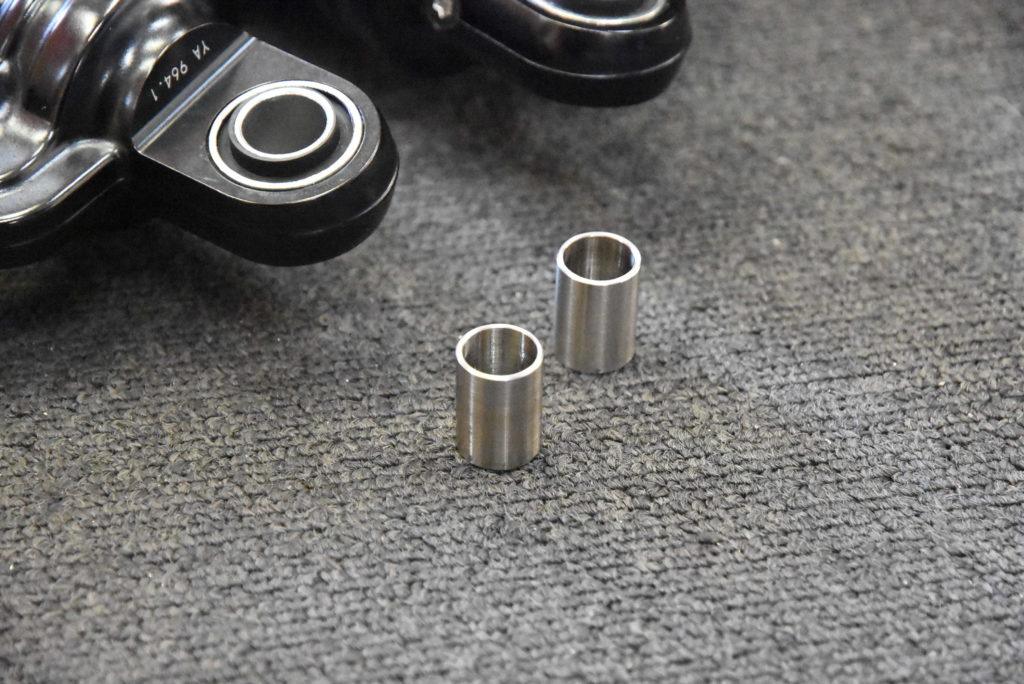 GSX1100S カタナ 1981年式 フレーム 組付け フロントスプロケットのオフセット決めでリアスプロケットからのラインを出して、オーリンズブラックラインXJR1300用の取り付けです! 上側の取り付け径が14~12Φへ変換ステンレスカラーの製作。続いてチェーンラインで外にオフセットした位置決めアルミカラーの製作と延長カラー付きワッシャーをステンレスでそれぞれ旋盤で削りました!! リアショックを取り付けてチェーンとのクリアランスOK♪ リアタイヤとチェーンクリアランスOK♪ リアの車高の位置決めです。写真の感じが良いと思います(変更があれば連絡ください)STDよりアクスルシャフト上で30mm上がっていて17インチホイールで20mm下がっていますので車高は10mmUPしています。リアショックで±の調整は可能です!現時点でスイングアームの垂れ角が8.5~9.5°です!入庫中の17インチ倒立カタナとほぼ同じです!