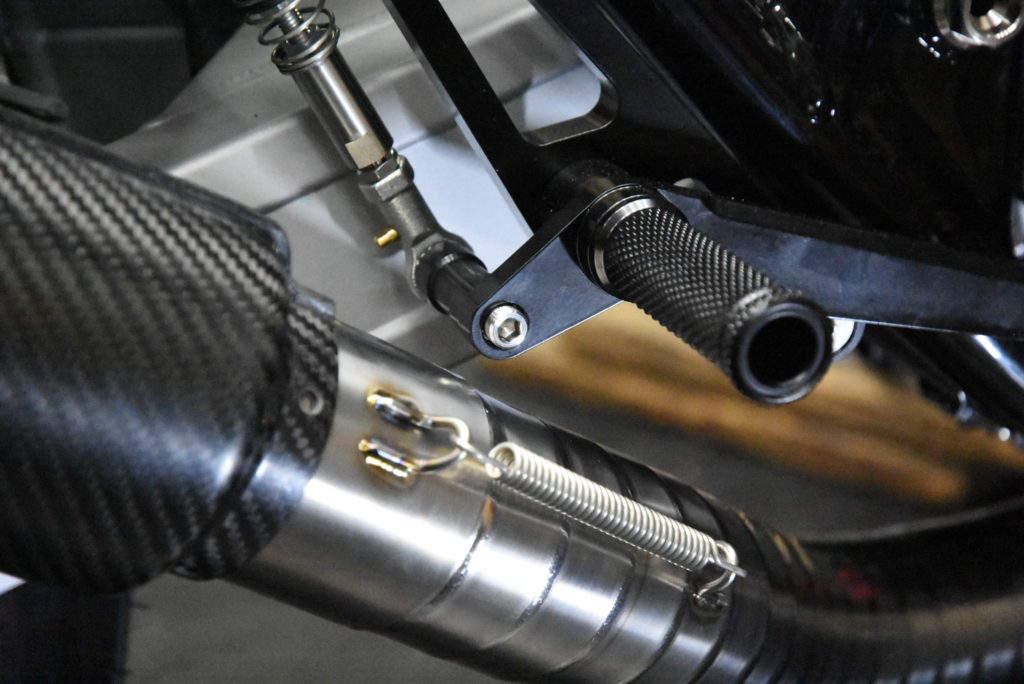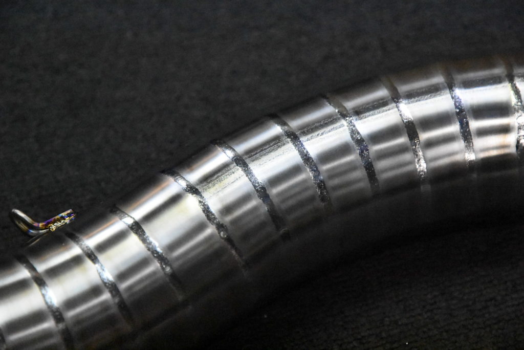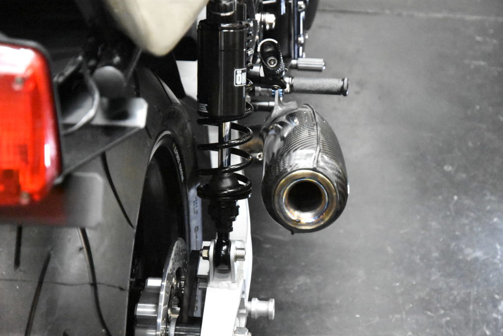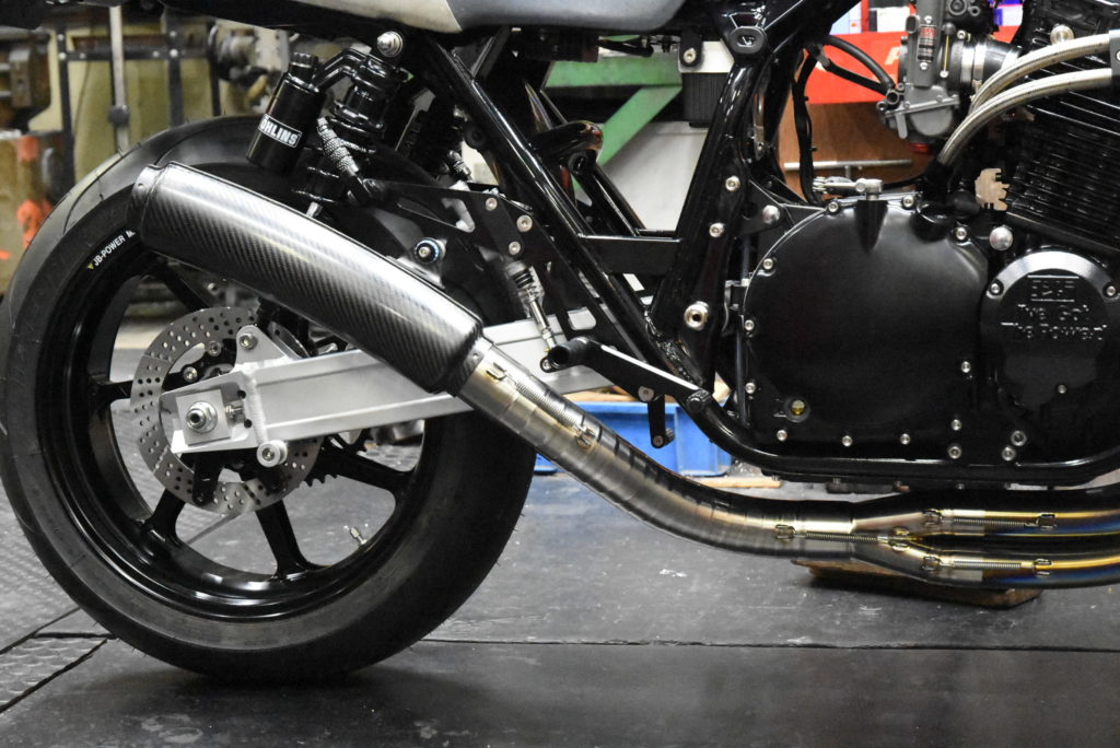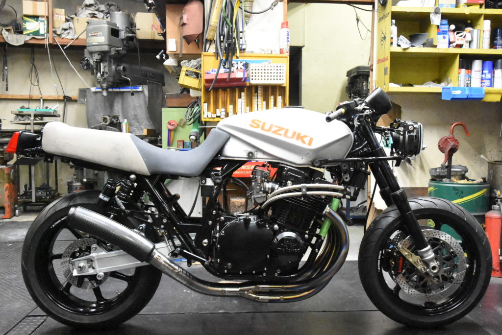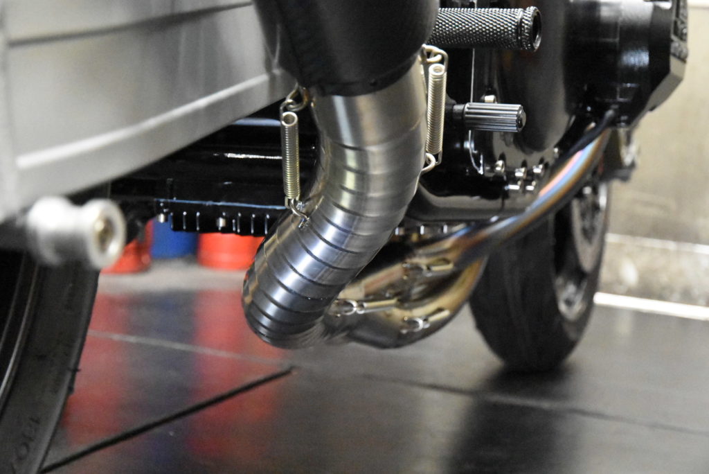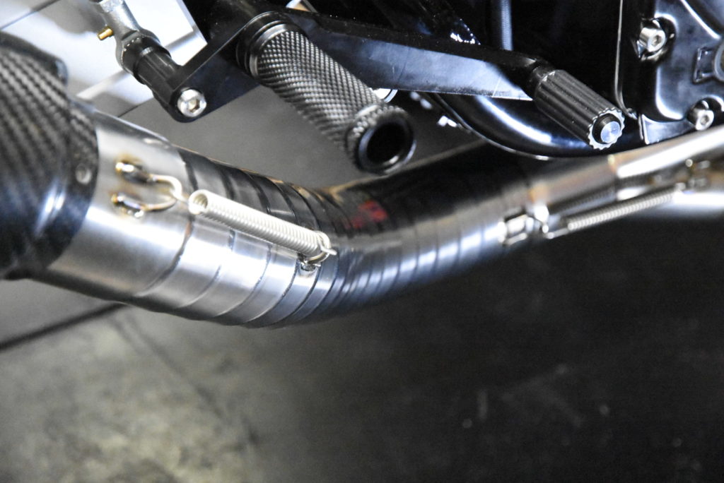 GSX1100S カタナ 1981年式 ワンオフマフラー製作 輪切りの曲がり具合をマスキングテープで確認して溶接するピースの数を溶接しました!集合の差し込み&スプリングフック溶接をして車体に装着!サイレンサーの角度OK♪ リアサスとサイレンサーのクリアランスOK♪ ブレーキペダルとテールパイプのクリアランスOK♪ 車体の傾きとサイレンサーのラインも良い感じです!明日 サイレンサーにウールを詰めてリベット打ちをしたら完成でサイレンサーをクリア塗装に出します! 次にフロントフェンダーブラケットの製作です!