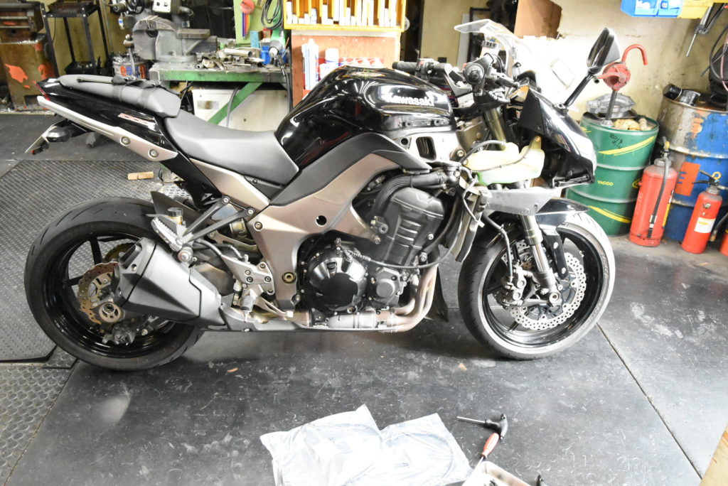 NINJA 1000 車検準備でスロットルワイヤー&クラッチワイヤーの交換です!クラッチレバーピボットカラーが固着していたので研磨してグリスUPして装着完了!スロットルもクラッチも軽くなりました♪ エンジンオイル交換でyacco MVX1000 4T 10W-50に交換!もう少しですが本日、終了!