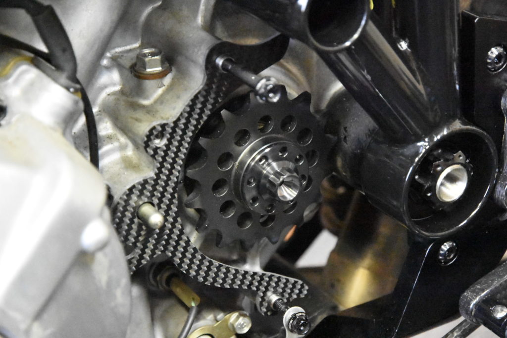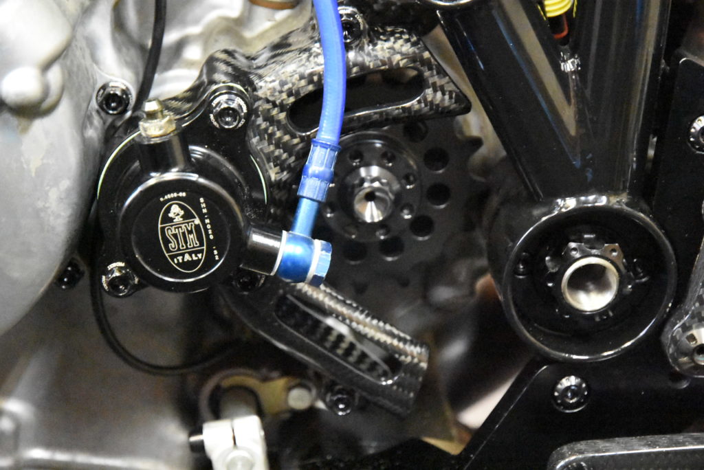 モンディアル ピエガ カーボン製のステップの取り付けです!カーボンブレーキペダルのドライベアリングのクリアランスが甘くガタが出るのでカーボン接着剤でカラーをペダルに接着固定して、材質が良くないサイドのカラーをジュラコンで製作&調整(調整が毎度大変!!)。 ステップバー類を増し締めして車体に装着! 続いてフロントスプロケット交換&カーボンプリントスプロケットカバー取り付け!!カーボンプリントで膨らんでいるので削って合わせての取り付けです!!クラッチピストンを取り付けて本日終了です♪ 時間がかかります!