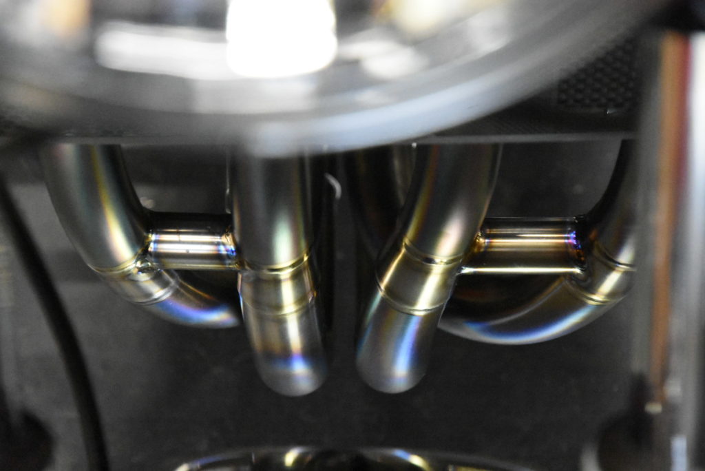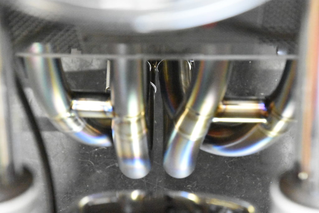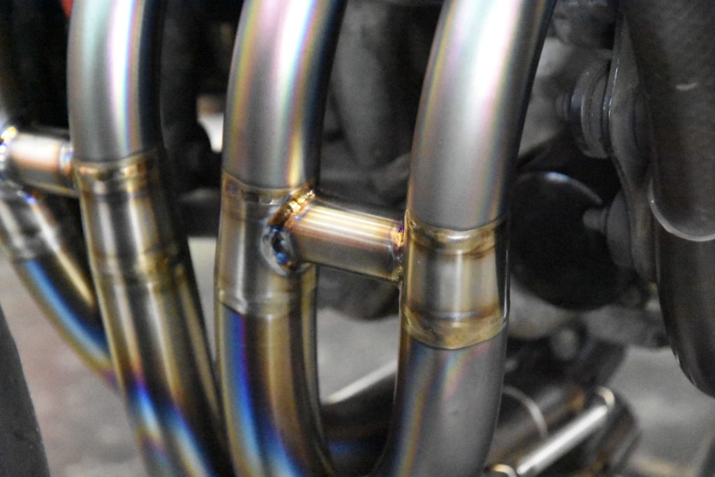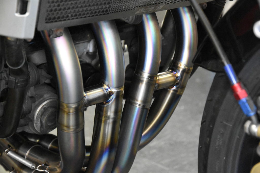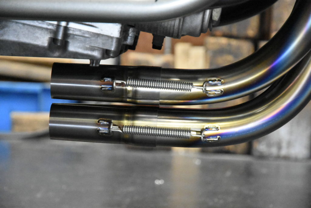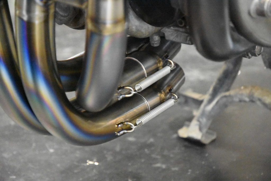 FZS1000 ワンオフマフラー 製作 今日は難関の連結パイプ製作です! 短いパイプですが、合わせて削っていくのに時間がかかり、思った位置に収まってくれません!何とか位置決めして何度も仮付けし集合の差し込み具合をチェックしながら本溶接です。それでも若干溶接歪が出ます。修正をしてエキパイを車体にセット&集合を差し込んでOKです! スプリングフックを溶接して、本日終了♪
