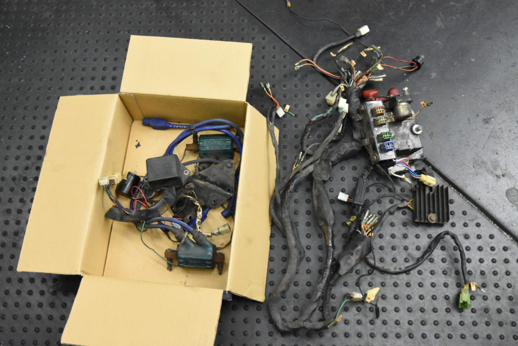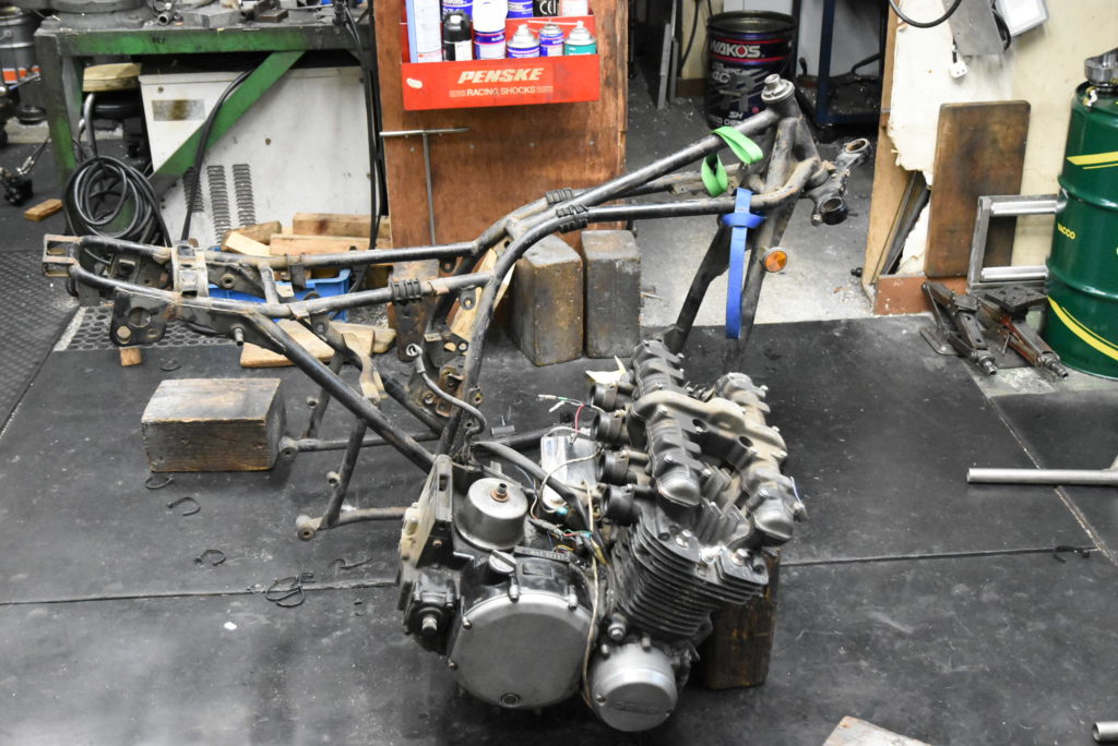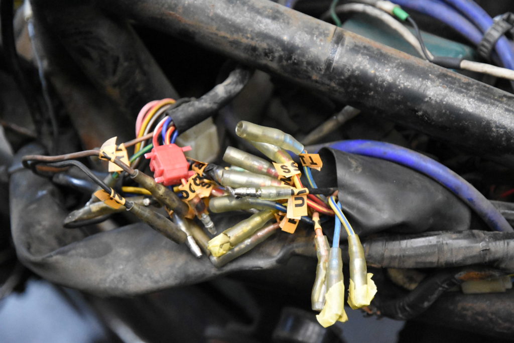 Z-2 メンテナンス エンジン&フレーム分離作業! ハーネスの取り外しで右ハンドルスイッチ外しにギボシ端子のマーキング・・!ハーネスを外しながらひたすらマーキングテープを貼りながらの取り外しで“元に戻せるかな~?”と心配してましたが、元通りには、しません!さらに良くしていくので組付けの時に考えます♪ 何とか今日中にエンジン&フレームの分離終了! エンジンも台車に乗せて工場を掃除して本日終了♪