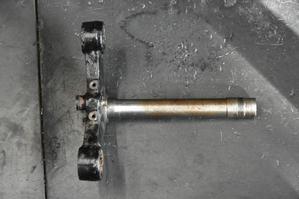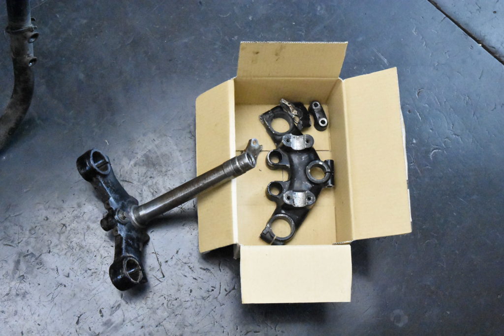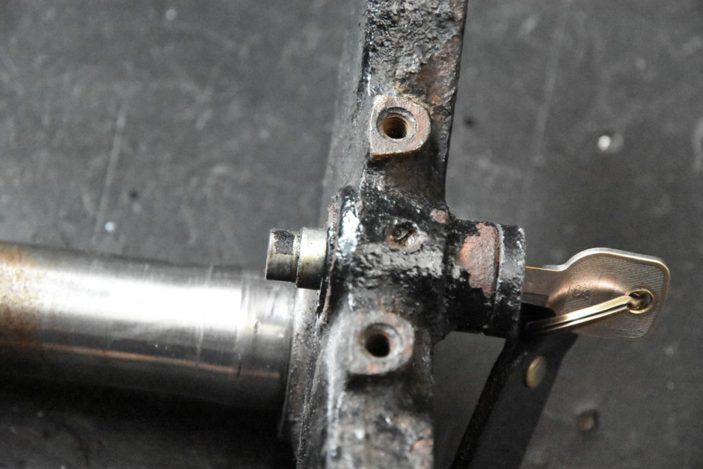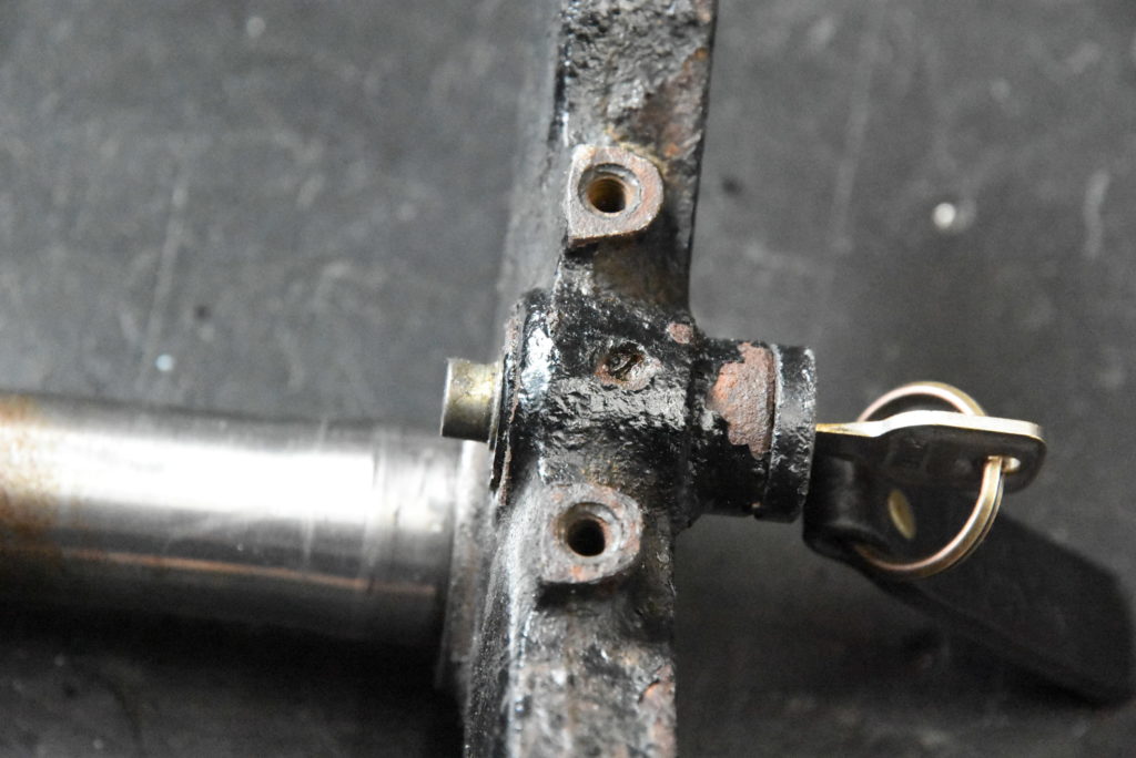 Z-2 メンテナンス フレーム類の塗装準備を進めています! ステムのハンドルロックが効かなくなっていたのでキーシリンダーを分解してピンの入れ替えをしておそらくボールが入っていたであろうボールを入れてグリスUPをして組みなおしました!ちゃんと動いてロックピンが上下に出て来ました♪ スイングアームのベアリングを抜いて準備完了!
