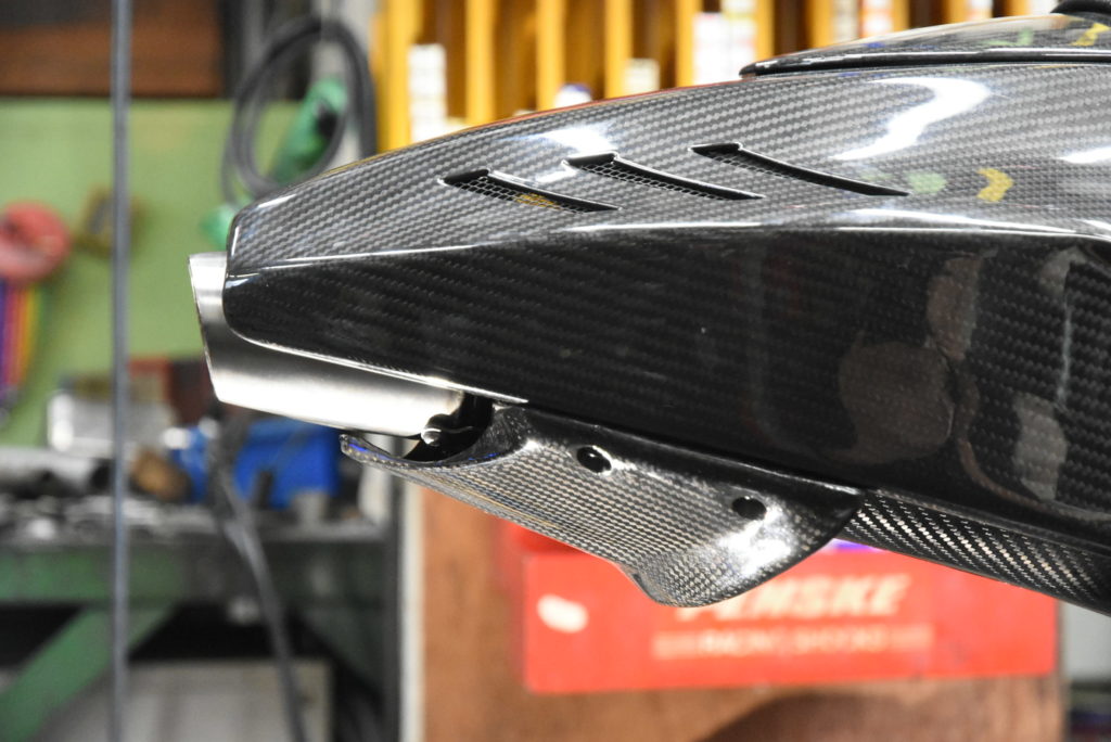 モンディアル ピエガ マフラー 製作 楕円テールエンドキャップを固定出来ました!!テールランプ固定カーボンプレートの突起が当たっていたので逃げ加工をして無事OKです♪ 目立たなくするのに考えました!完成までもう少しです!!