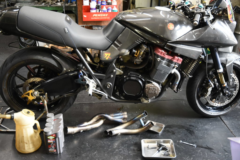 油冷カタナ 車検準備 昨日の作り変えでチタンプレートを製作!寸法をだして穴あけ!しっかりボルト止です! 中途半端に出っ張ると破損の原因になるのでシートカウル内に収めました! シーケンシャルウインカーで左右の幅は規定内で車検OKのはずです!続いてブレーキ&クラッチオイル交換!エンジンオイル&オイルフィルター交換!オイルはyacco MVX1000 4T 10W-50 です!サイレンサー消音加工して車検準備完了♪