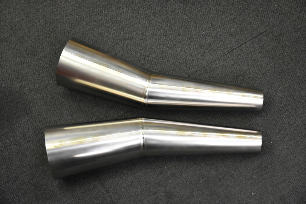 ノートン コマンドー 961 ワンオフマフラー製作 角度を合わせながらテーパーパイプ溶接を何とかクリアしました♪ 5mm~3mm幅で少しづつカットしては面擦り合わせをしてはまたカットの繰り返しです。カットしすぎるとマイナス段差が出来てNGになってしまうので失敗が出来ないので時間をかけて作業しました!疲れました・・・!