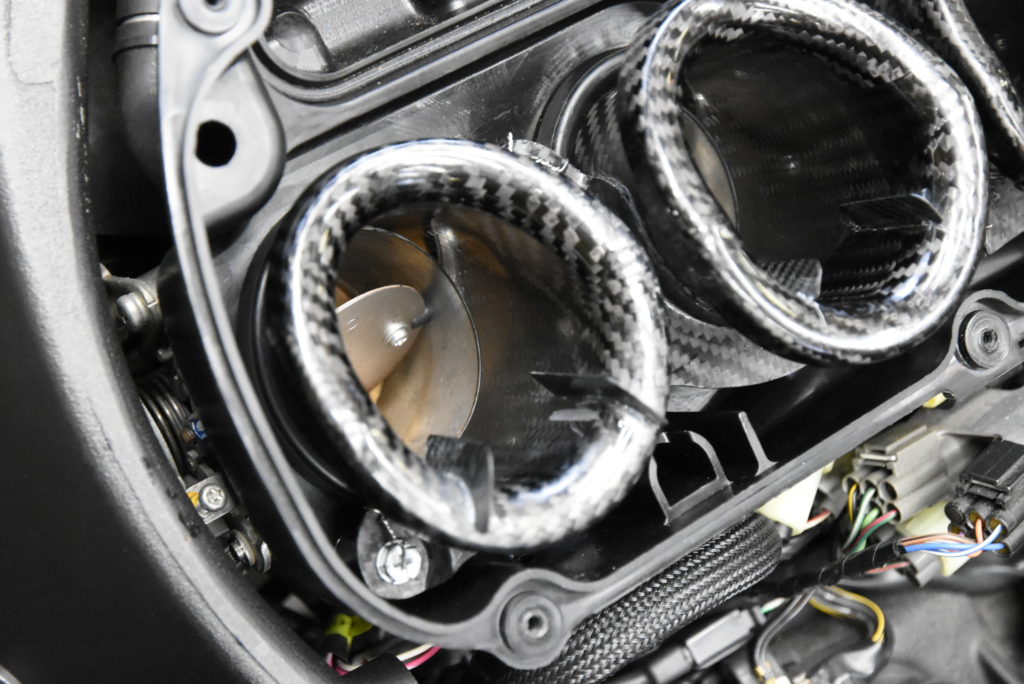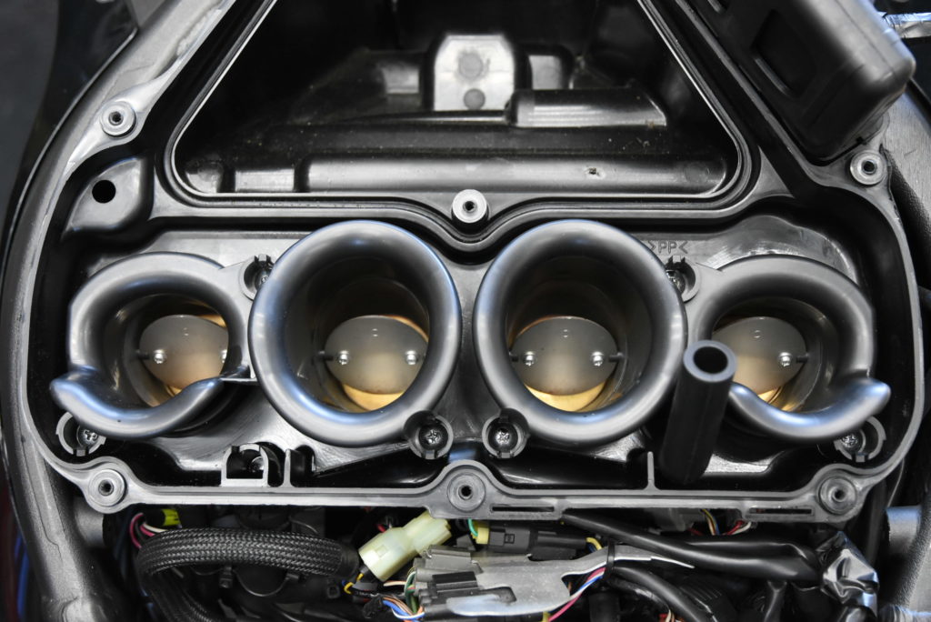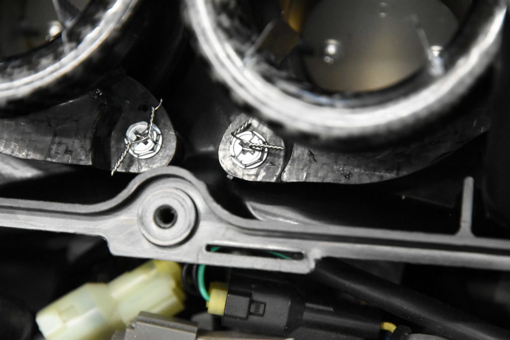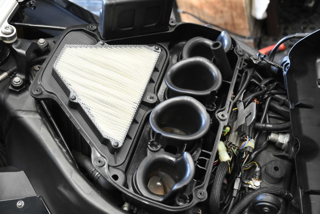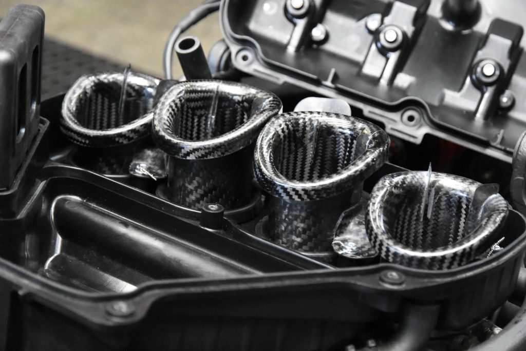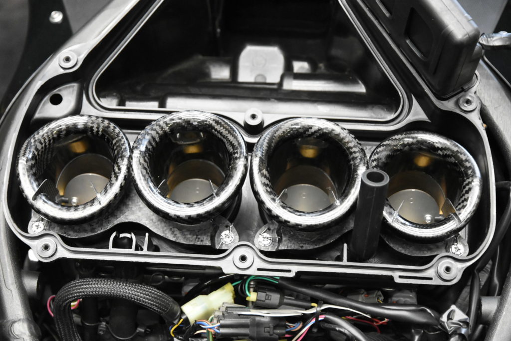 ZX-10R のカーボンファンネルの取り付けです!以前紹介した性能が、“FIM世界耐久ロードレース選手権(EWC)のトップチームのデータベースで型から作って、少し長くなっていてトルクが出る仕様です!ファンネルの入り口の整流板の効果が凄く楽しみです♪”・・・午前中にノーマルファンネルで試乗すませて、カーボンファンネルの取り付けです!取り付け差し込みの楕円形をピッタリ合わせてインジェクターボディとの段付き無しです! もうこれだけでも市販の製品ではありえません。ボルテックスゼネレーター(整流板)に気を付けて装着してワイヤーリング用に加工したボルトで固定&ワイヤーリング!!ついでにK&Nエアーフィルターの交換して取り付け完了♪ テスト走行です、エンジン始動のレーシング(空ぶかし)から??まさか気のせい!!いざ走行すると明らかに低速が乗りやすい♪ 6速でも強く引いてくれます!2速&3速で開けると中速のつながりが表現できないくらいの心地よいトルクの出方をします!ドカーンではなくコーナーの立ち上がりで怖くないパワーの出方・・みたいな♪ とにかく凄いファンネルです!Kawasaki車の欠点を完璧に補っています♪ 恐るべしボルテックスゼネレーター&カルビ新井社長!!