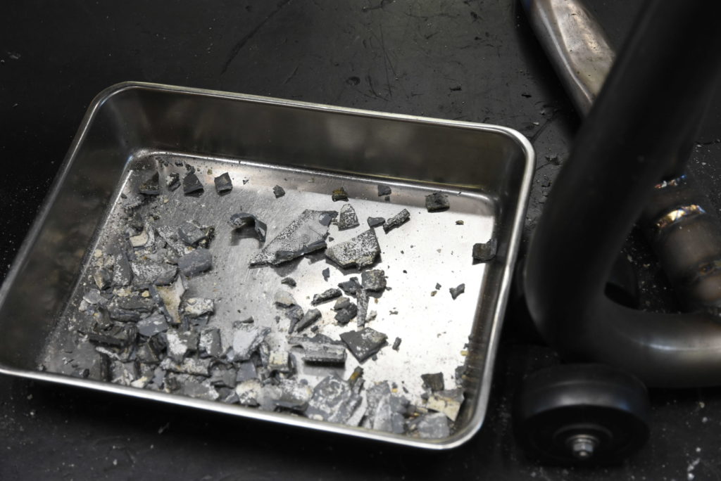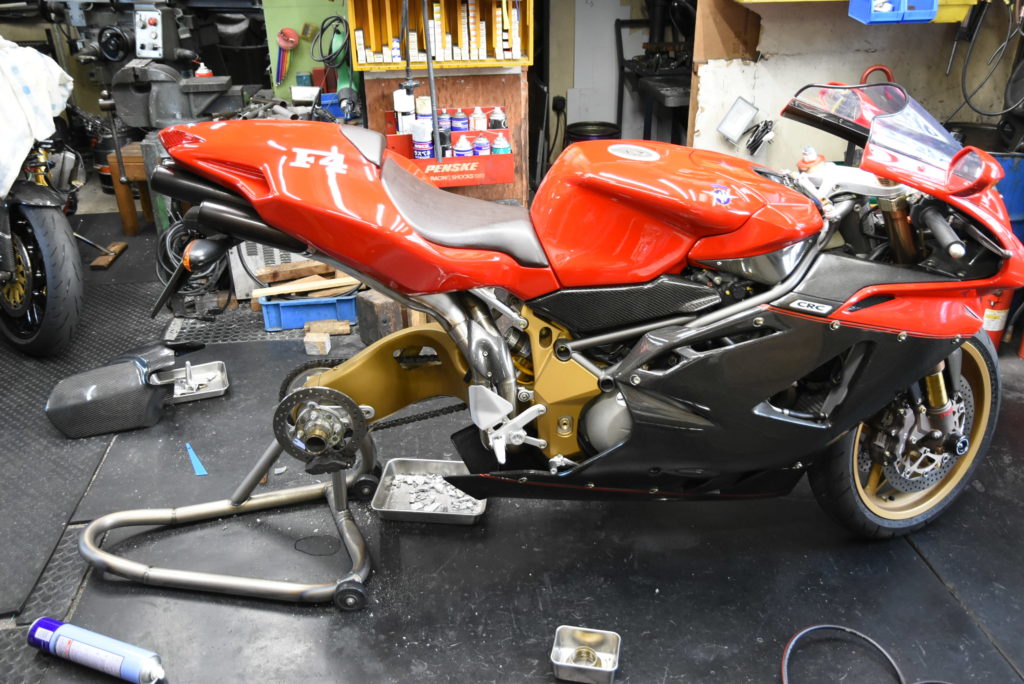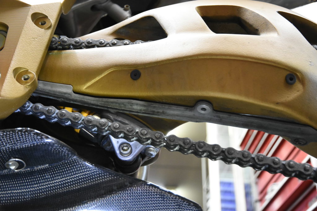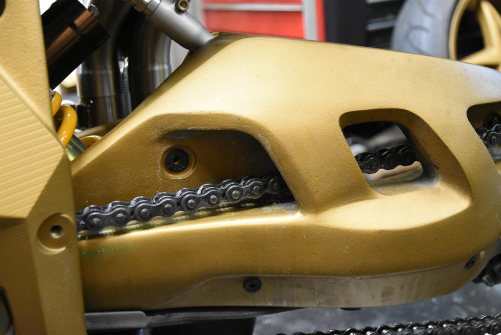 MV AGUSTA F4 serie oro メンテナンス 明日 岐阜県から来客があるのでお昼過ぎまで片付けをして疲れました!F4チェーンスライダーは廃盤なのでワンオフで製作することにしました!外して寸法取りをしようと思いましたが・・ボロボロ崩れて粉々になりました。張り付いた欠片をプラスチックのへらで取り除き作業に時間が掛かりました!Lの形状の40cmアングルを作ればよいのですが丁度の材料ないので60~70mmの丸棒から削り出し?? 大変そう!!