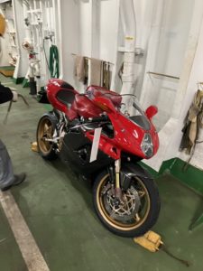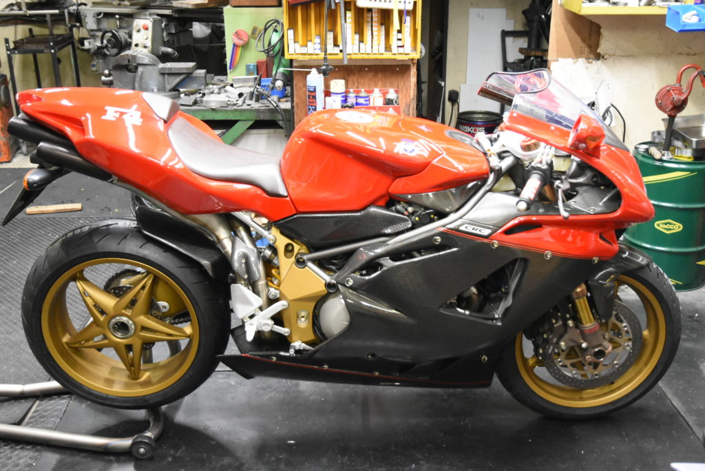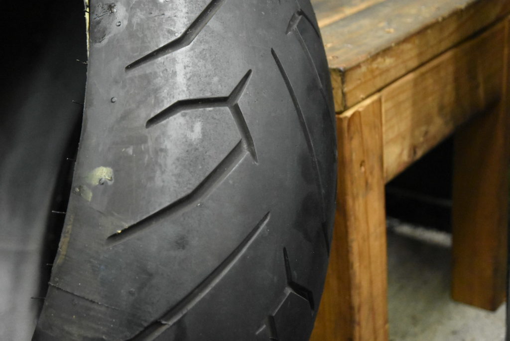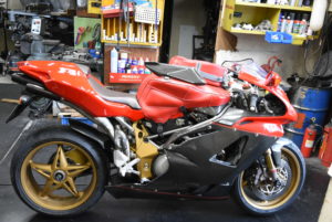 MV AGUSTA F4 serie oro メンテナンス タイヤ交換でチェンジャーにリアホイールをSETしていざ交換・・タイヤビートをアームに乗せるの事が出来ません???ホイール内部形状もありますがタイヤが硬くてビクともしません!!ホイールが割れるかチェンジャーが壊れるか??くらいピンチでした!タイヤレバーを延長してもNGで結局タイヤをバナーで温めて(熱く)柔らくして何とか反対側ビートがホイール内部溝に落ちてビートがアームに乗って外れました!!2時間・・汗びっしょり!!過去最高の難儀です! 2008年製造 そりゃあ硬い♪ この手の限定車はハイリスク、普通に壊したらどうしよう・・と凄い孤独感になります。上手く出来ても今回は上手くいった・・で終わり! BS S23 に無事交換して前後ブレーキ&クラッチオイルを交換して車検準備完了のはずでしたが・・オドメーターに切り替わりません!!困った。乗らないトラブルが続きます♪