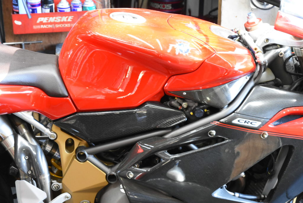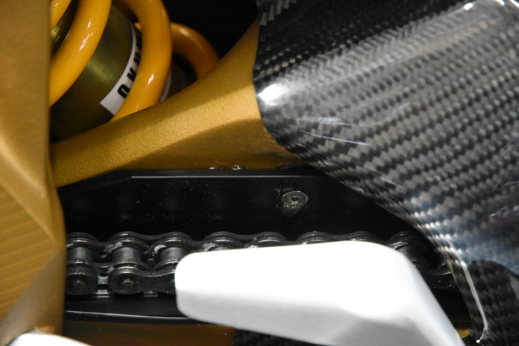 MV AGUSTA F4 serie oro メンテナンス 完了と思いましたがチェーンスライダーのボルトが緩みます。振動が原因だと思います。隙間にシリコンをボンドでネジロックをしていたのですが・・手ぬるいのでまたリアスプロケットを外してチェーンスライダーを抜き取り新品のウェルナットに交換してゴム系のボンド(SU)をたっぷり塗って装着固定!この方法しかありません!早く届けたいのですが不都合が合ったら対馬なので・・・完全接着後テスト走行です! なかなか終わりません!社外品のサイドカバーはOKです♪