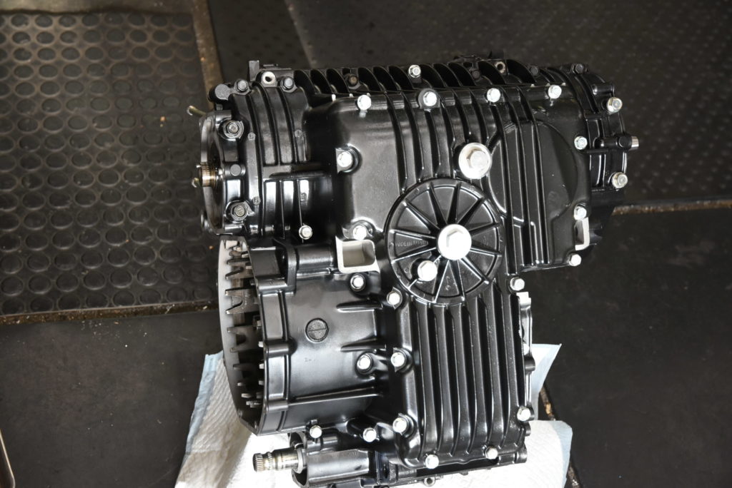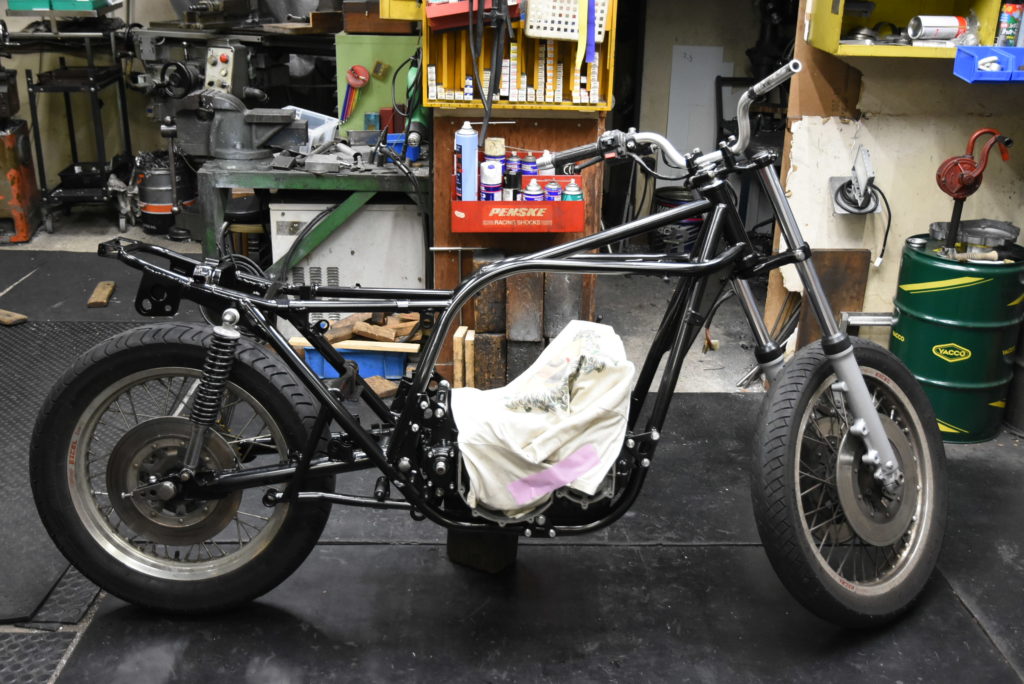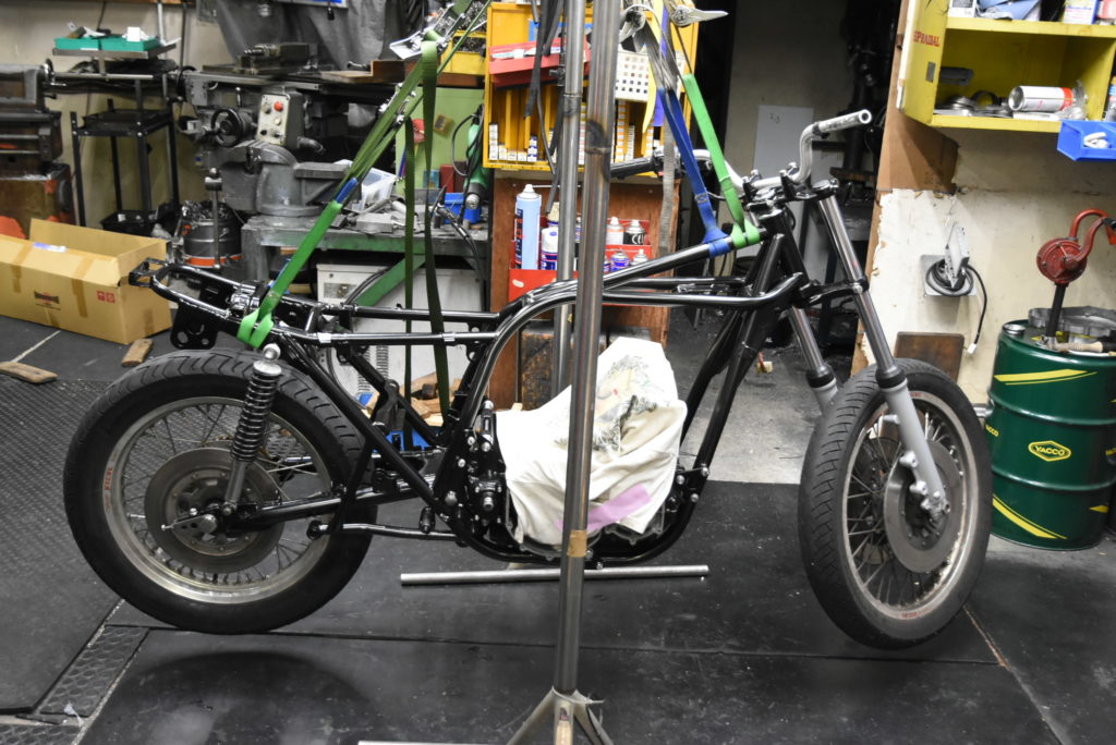 Z-2 メンテナンス オイルポンプ&オイルフィルターなど組付けてオイルパンを取り付けました♪ まだエンジンが持てる重さなのでフレームに搭載!!移動できるようにフォーク・スイングアーム・リアショックと前後のホイールを取り付けました! 後はエンジン組付けと車体パーツは磨きながら取り付けです!