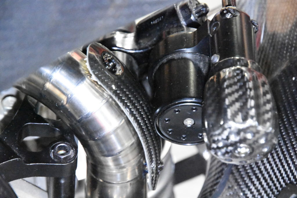 モンディアル ピエガ パーツ 取り付け タンク下のホースジョイント部のクリアランスは大丈夫なのでヒートガードなしでOK! リアショックのリザーバータンクの所!エキパイのRと丁度に合わせて削って何とか形にして裏に耐熱シートを貼りました!固定なのですがそもそもクリアランスが無いので固定ナットが薄くボルトのかかりをギリギリで製作、位置を何度も確認して仮付けから本付け溶接でリザーバータンクとのクリアランス確保で成功しました♪ 良い感じのカーボン製のプリロードアジャスターノブを取り付けて本日終了!!