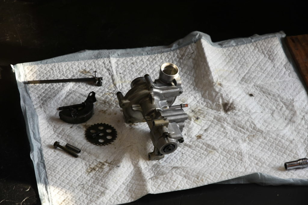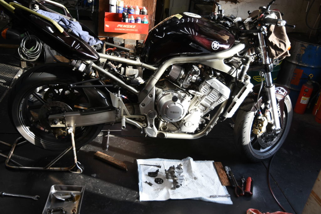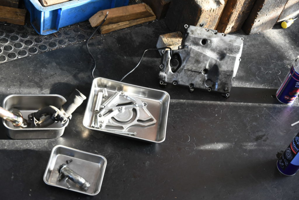 FZS1000 ウォーターポンプのオーバーホールでマフラーその他のパーツを取り外して洗浄です!かなり汚れていてマフラー磨きも含めて時間が掛かりました!ポンプを分解したら予想通りにメカニカルシールがNGでした!事前に用意していたメカニカルシール・オイルシール・ベアリングを交換して組んではみましたが・・・インペラの錆が想定以上にひどくて磨いてシールを入れたのですが面が確保している自信が無いのでインペラも交換します。その方が安心です♪ エンジンに組付け保留です!