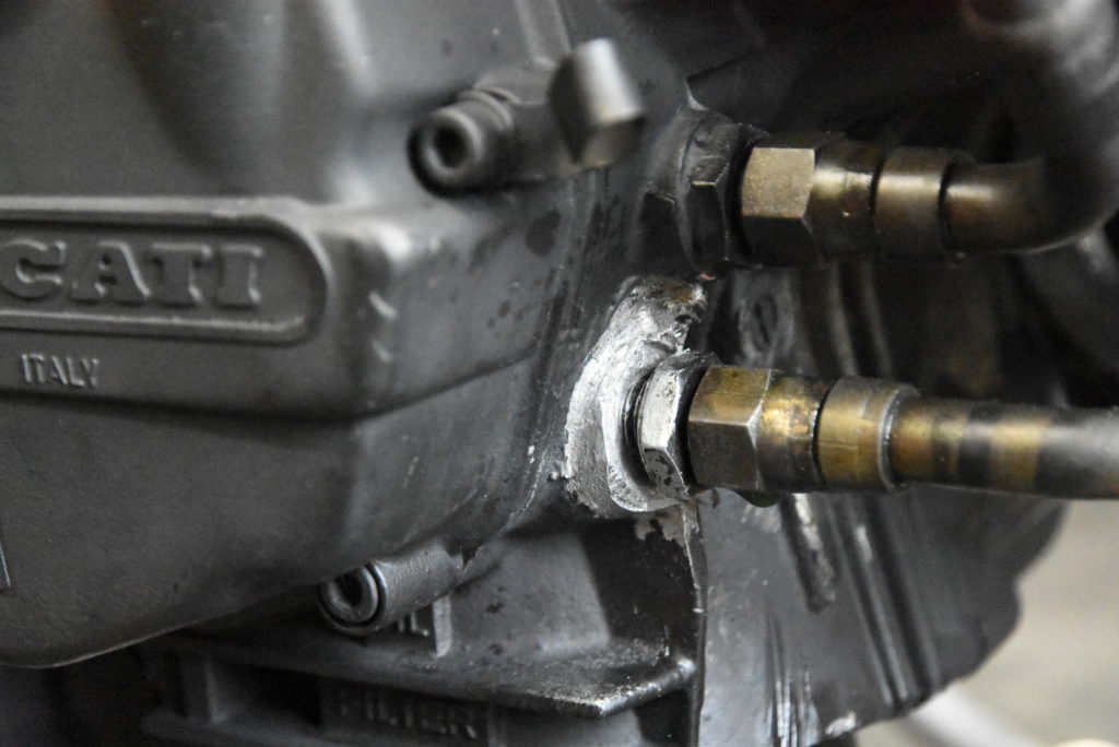 DUCATI M900 業者さんの緊急修理でケースが欠けていてオイル漏れが止まらないとの事で・・ネジ加工が難しいとのことでユニオン自体をケースに溶接依頼です! ケースが鋳物・オイルまみれの部位・ユニオンのアルマイトなどが難関で時間をかけてケースの洗浄・ユニオンのアルマイトはがしをして車体の下にもぐって溶接しました!しっかり溶け込んで溶接出来たので漏れは大丈夫と思います♪ ありがとうございました。