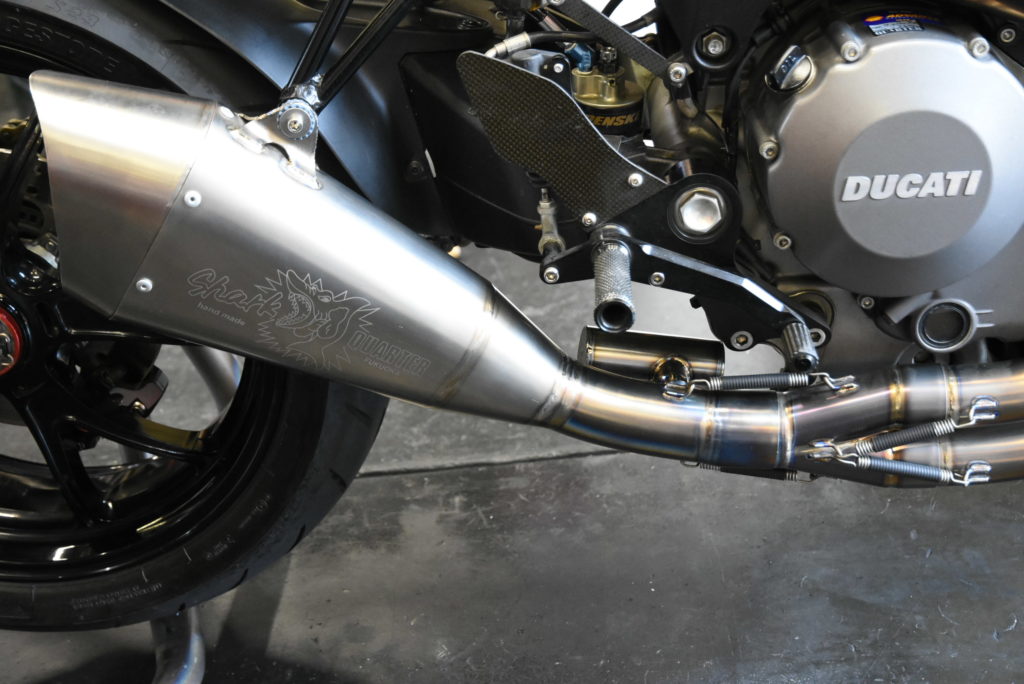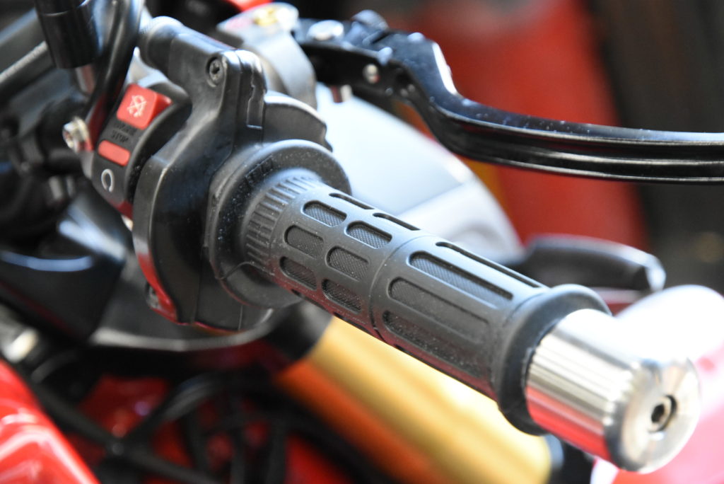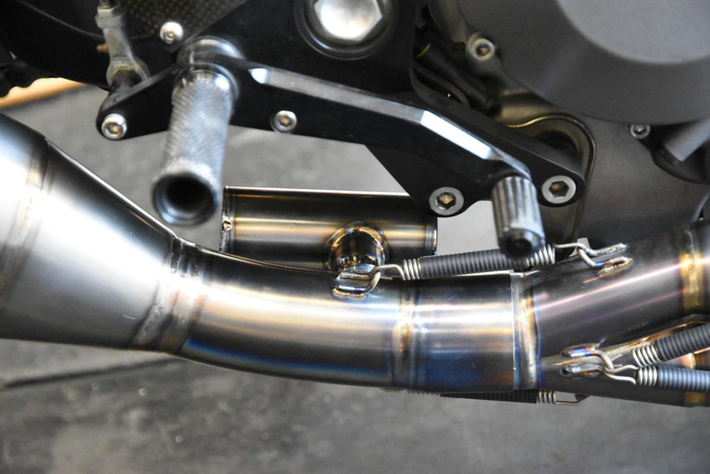 DUCATI M1100EVO メンテナンス 昨日の続きでトルクチャンバーの取り付けです!短いテールパイプの裏に取り付けました♪ 効果はやはりマイルドに低速が乗りやすくなり、音も歯切れ無くなるので静かに感じます! 最後にグリップを手にグリップ(親父ギャグ?)するとても良いヨシムラ製に交換ですべてのメンテナンス完了です♪ 良い季節になりますのでガンガン走ってください! G様 大変お待たせしました!!