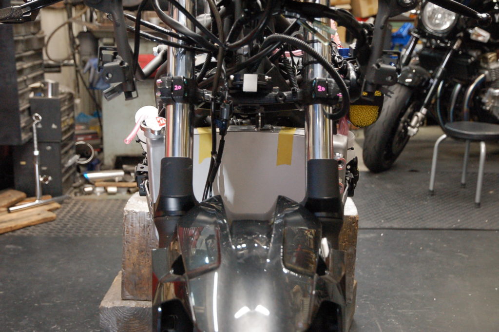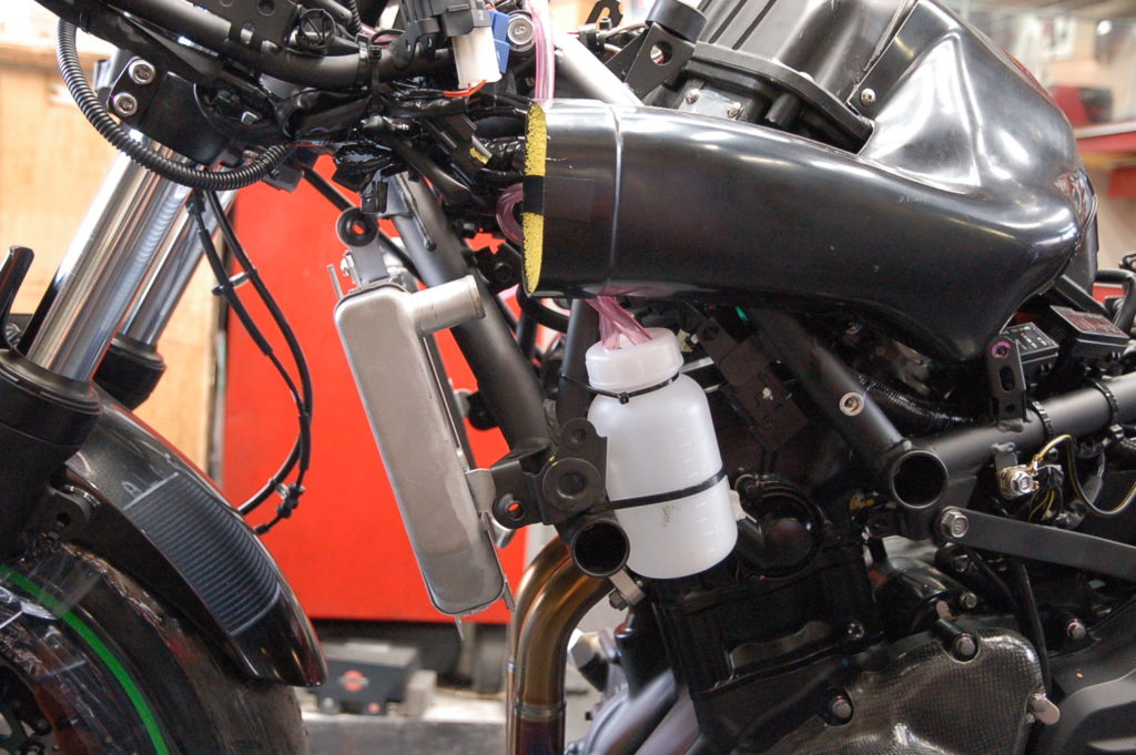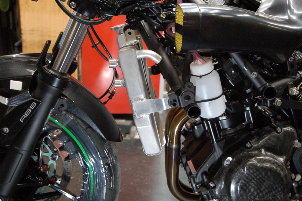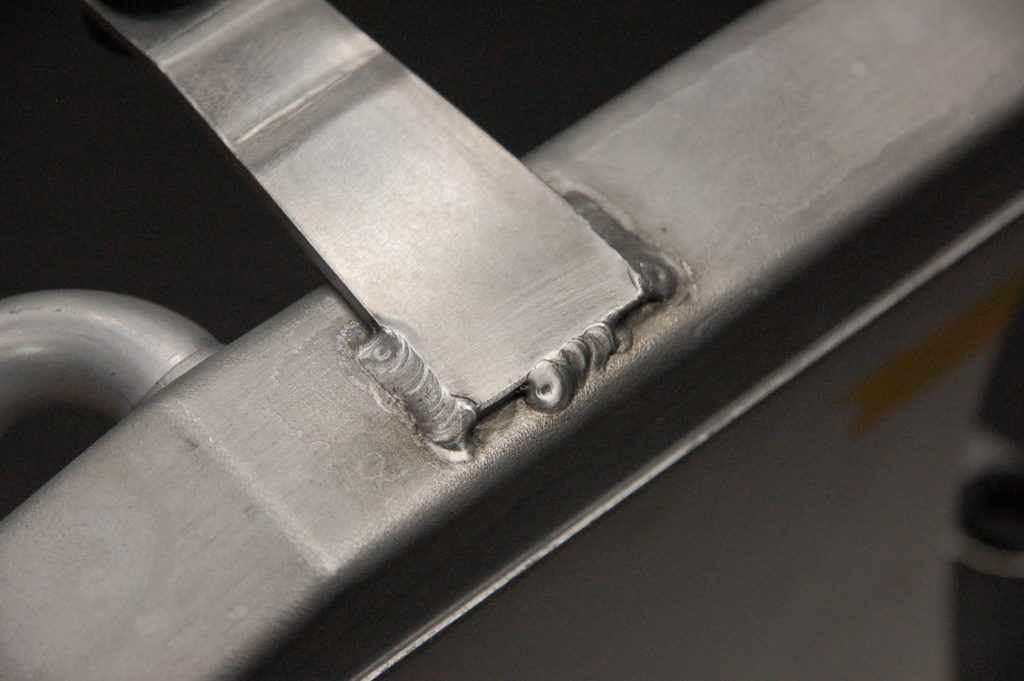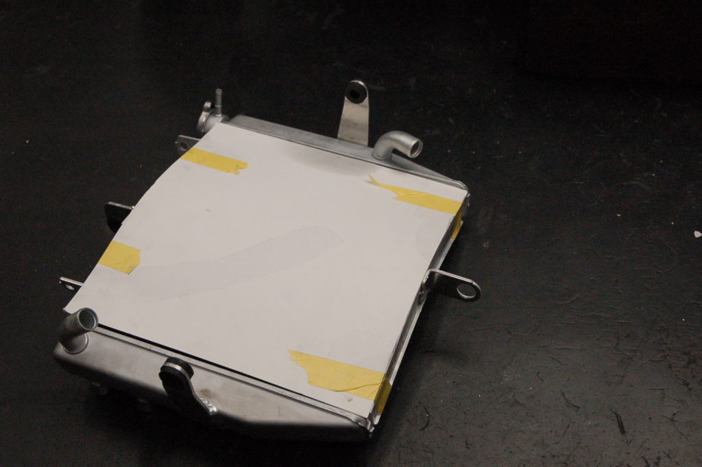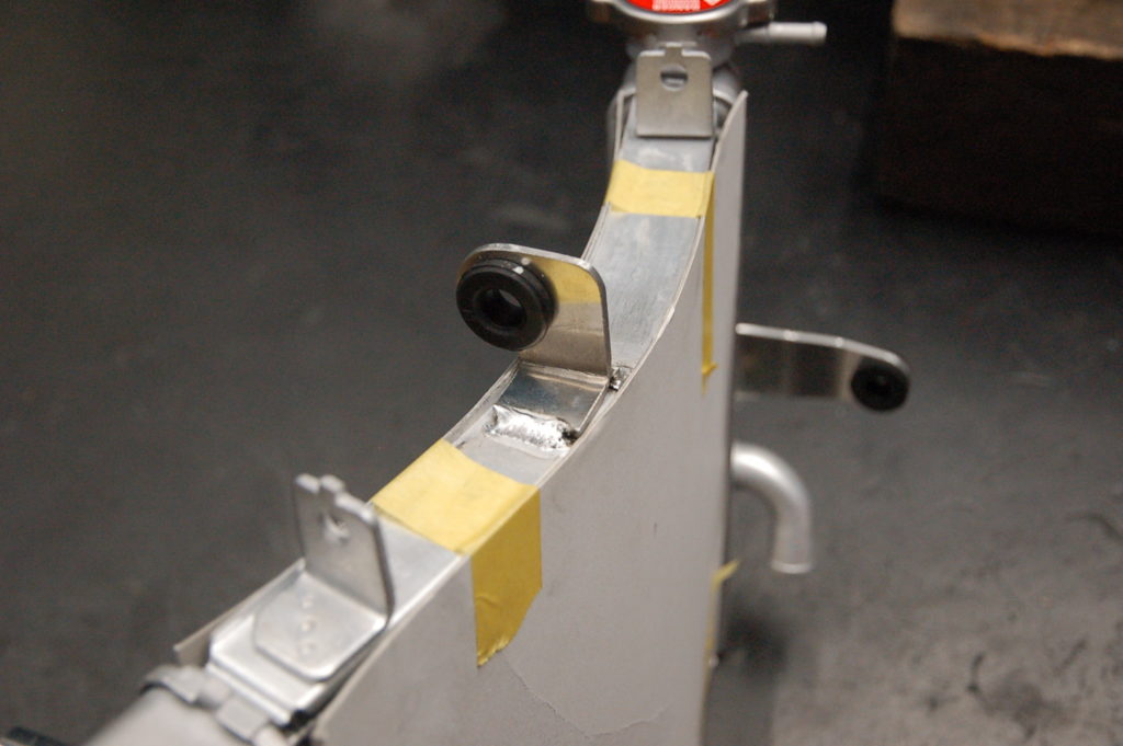 ノーマルと形状が違うので位置設定が大変で助手がいないので一人でマーキングが・・・!ステーをカットしてダンパー用の穴あけして溶接です・・・これがラジエターの材質は難しく、左のステーを溶接したのですがステーの裏に巣穴(エアーホール)出来ていてラジエターにエアーで圧をかけるとぷくぷく小さな気泡が出て何度しても出ます!外して穴を埋めてから溶接か、ラジエターに接している所をぐるっと溶接か?になります。ぐるっと溶接で漏れは無くなりました♪ これで何とか完了しました! S様 お待たせいたしました。