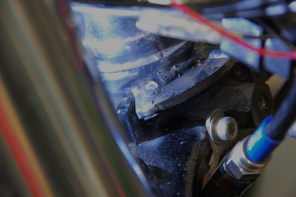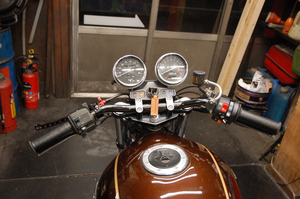 預かってほぼ2ケ月経ってしまいました。やっと取り掛かっています。ヘッドライト&ライトステーを取りはずしてカウルをフィッティングです、低めのハンドルを選んで仮付け!!ハンドルを切るとタンクに当たります、当たらない所のクリアランスを測定して延長ストッパー製作&溶接しました!切れ角はOKですがハンドルロックがかかりません!車検がNGです、あとで削って修正です!カウルはタンクのラインより少し上くらいで収まりそうです。フレームのヘッドパイプのところにカウリングマウントブラケットを製作&溶接です!それからカウリングステーをカウルの位置に合わせながら製作です!