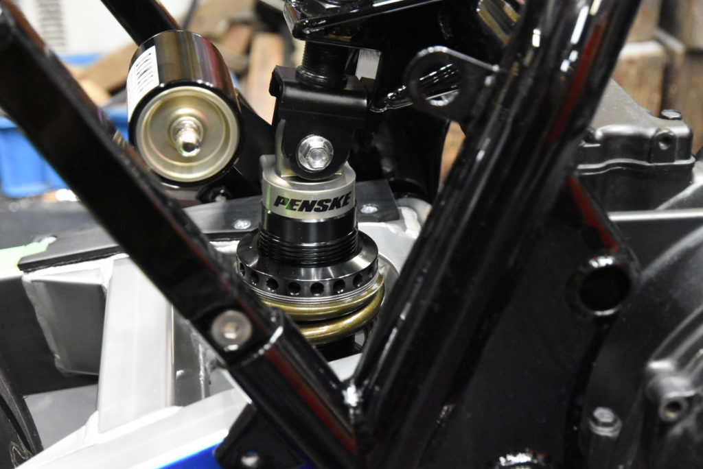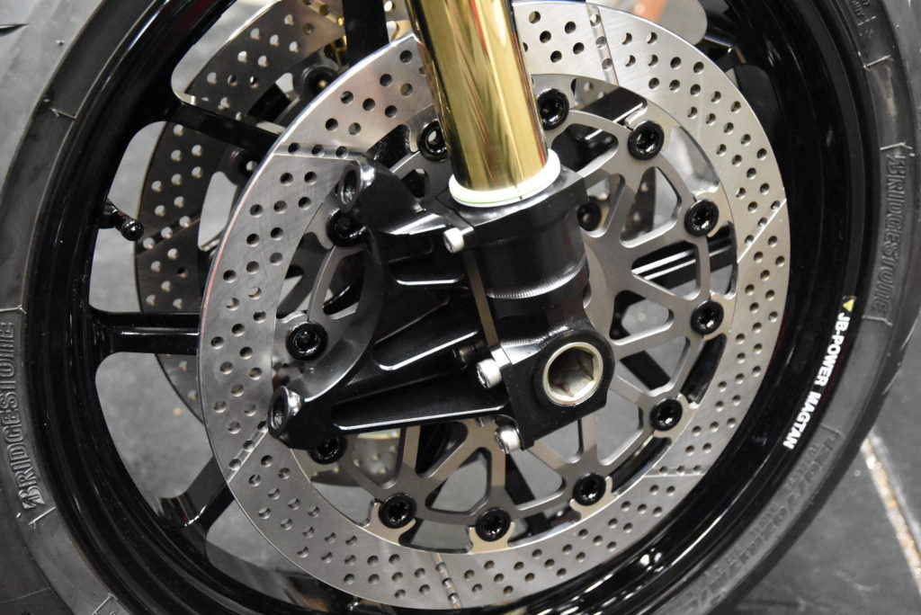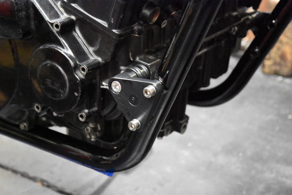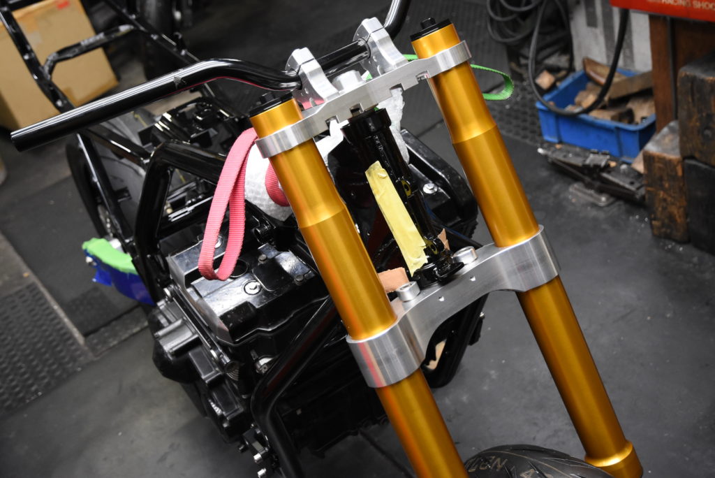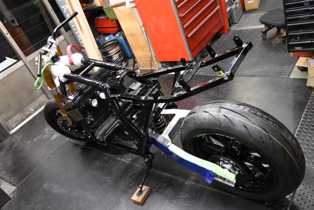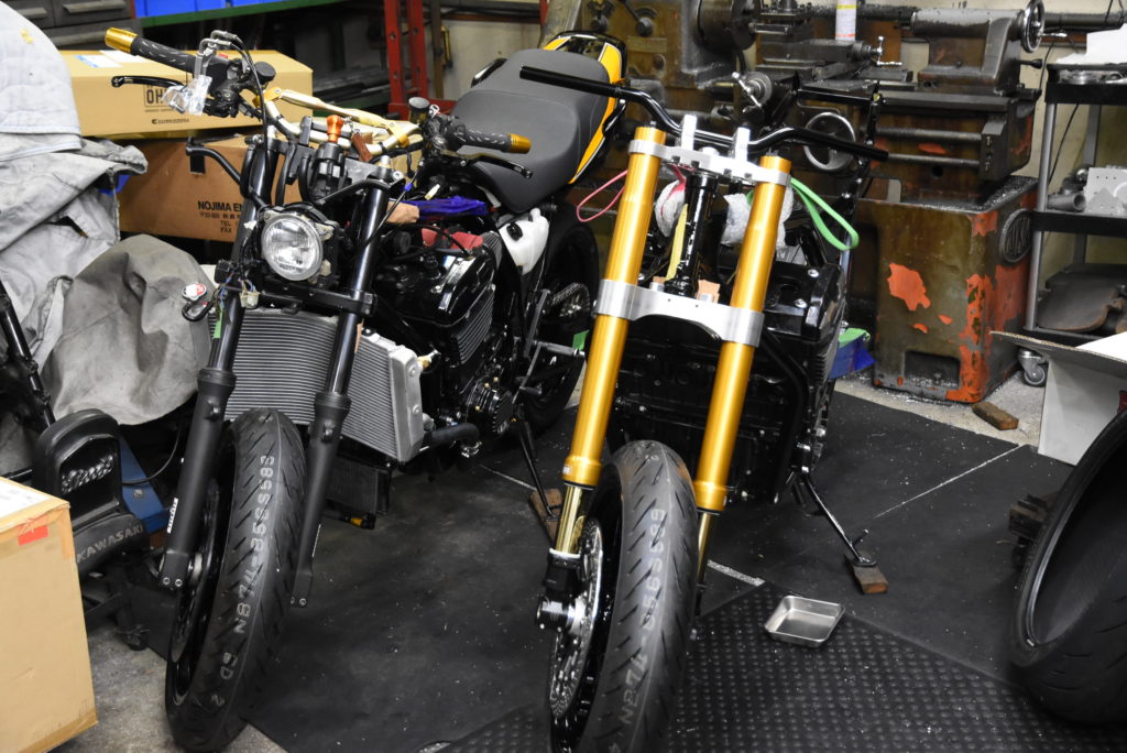 ZRX1100 NJ-1 のフレームに保護テープを貼ってエンジン横にしてフレームを載せました!エンジンマウントボルトを通して仮組でオイルパンを組付けました!!エンジン付きフレームを抱えて木のブロックに乗せました、エンジンのパーツがフルに装着されてないので一人で持ち上げ出来ました!!!デッドリフトの様に・・・♪ サブフレーム・スイングアーム・サスペンションリンク・リアショック・ホイールを取り付けてリア回りOK!!フロントは吊り上げてステム・フォーク・キャリパーブラケット・ホイールを装着してハンドルを仮組!!サイドスタンドを取り付けて自立しました♪ イメージ通りにパーツの組み合わせが出来ました!! ZRX1200 NJ-1のフォークも今月末には入荷しそうなので2台同時作業ですね!!